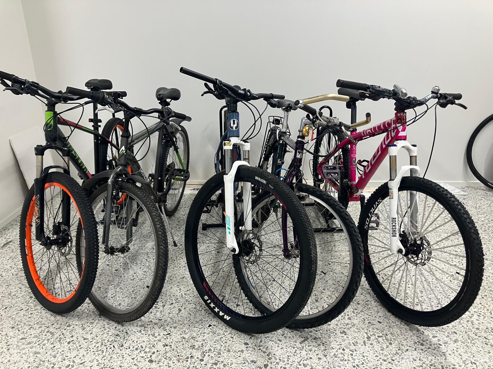 Nippu käytettyjä vaihdossa tulleita pyöriä.