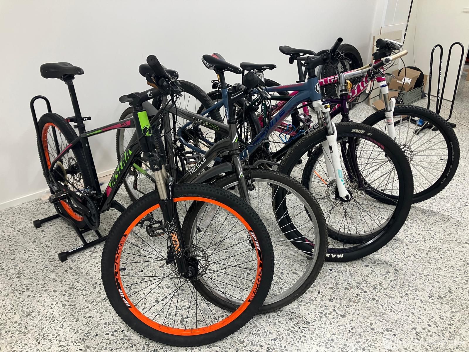 Ajamalla tulleet pihaan muut paitsi retro-Trek josta mm. puuttuu pakka ja takavanne on halki.
