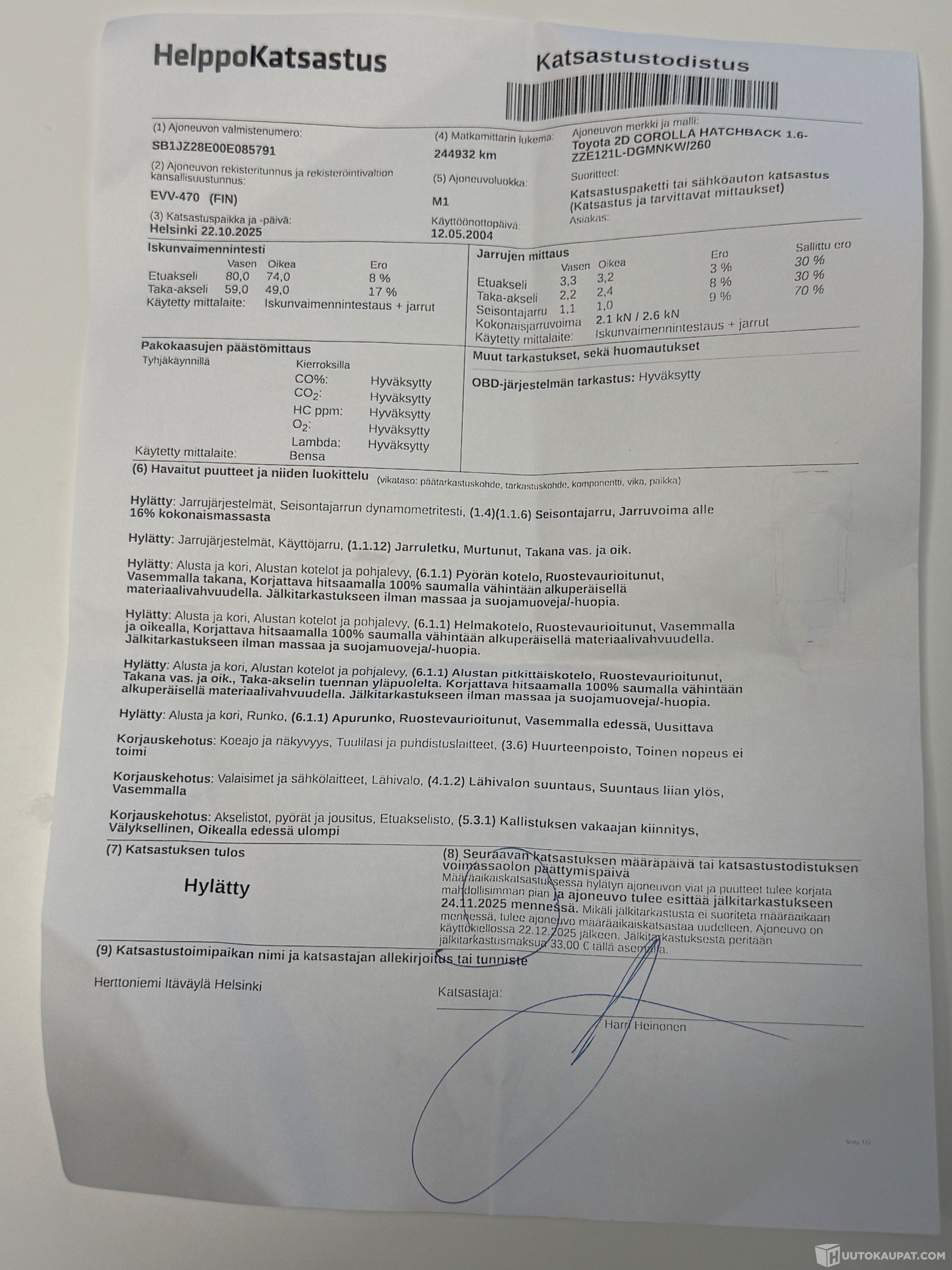 Kuvissa on katsastuksen vikalista, josta selviää tarkemmin havaitut kohdat.