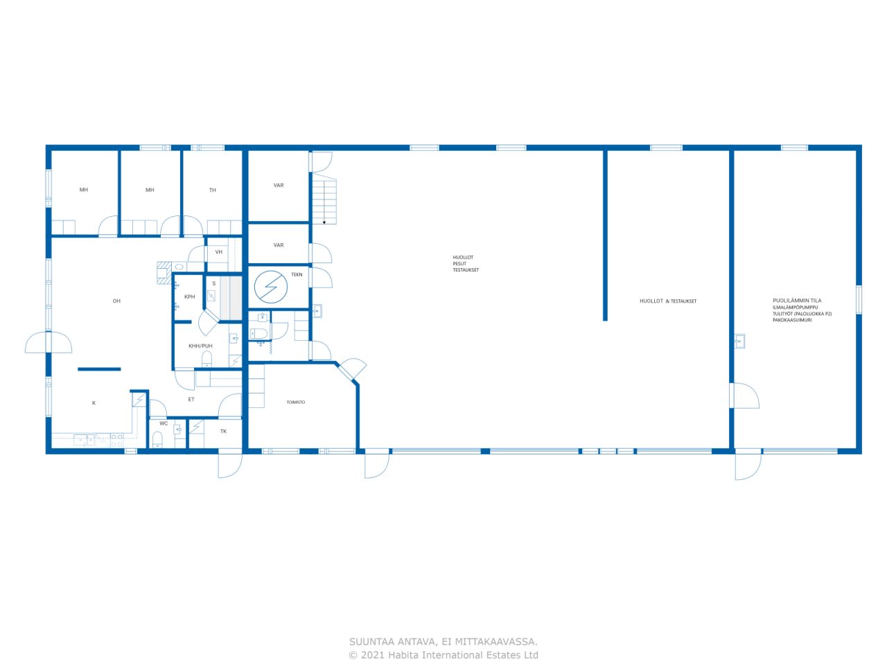 Hallissa on noin 235m2 suuruinen lämmin halliosa, jossa on hallin lisäksi asiakastila, toimisto, pesutilat, tekninen tila ja kaksi varastoa. Hallin toisessa päässä on noin 60m2 suuruinen puolilämmin tila. Halliin on neljä korkeaa nosto-ovea, joista kolme johtaa lämpimälle ja yksi puolilämpimälle puolelle. Pihassa on iso autokatos, jossa on tilaa noin kymmenelle autolle. Piha on asfaltoitu. Autokorjaamon irtaimisto on neuvoteltavissa osaksi kauppaa. Hallin lämpimässä osassa on sähköllä lämpiävä vesikiertoinen lattialämmitys ja puolilämpimässä ilmalämpöpumppu. Kiinteistön (halli ja asunto) sähkönkulutus on ollut vuodessa noin 30 000kWh. Energiaremontilla (esim. vesi-ilmalämpöpumpulla) sitä voi saada alhaisemmaksi. Halli vapautuu noin 2 kuukaudessa kaupanteosta.