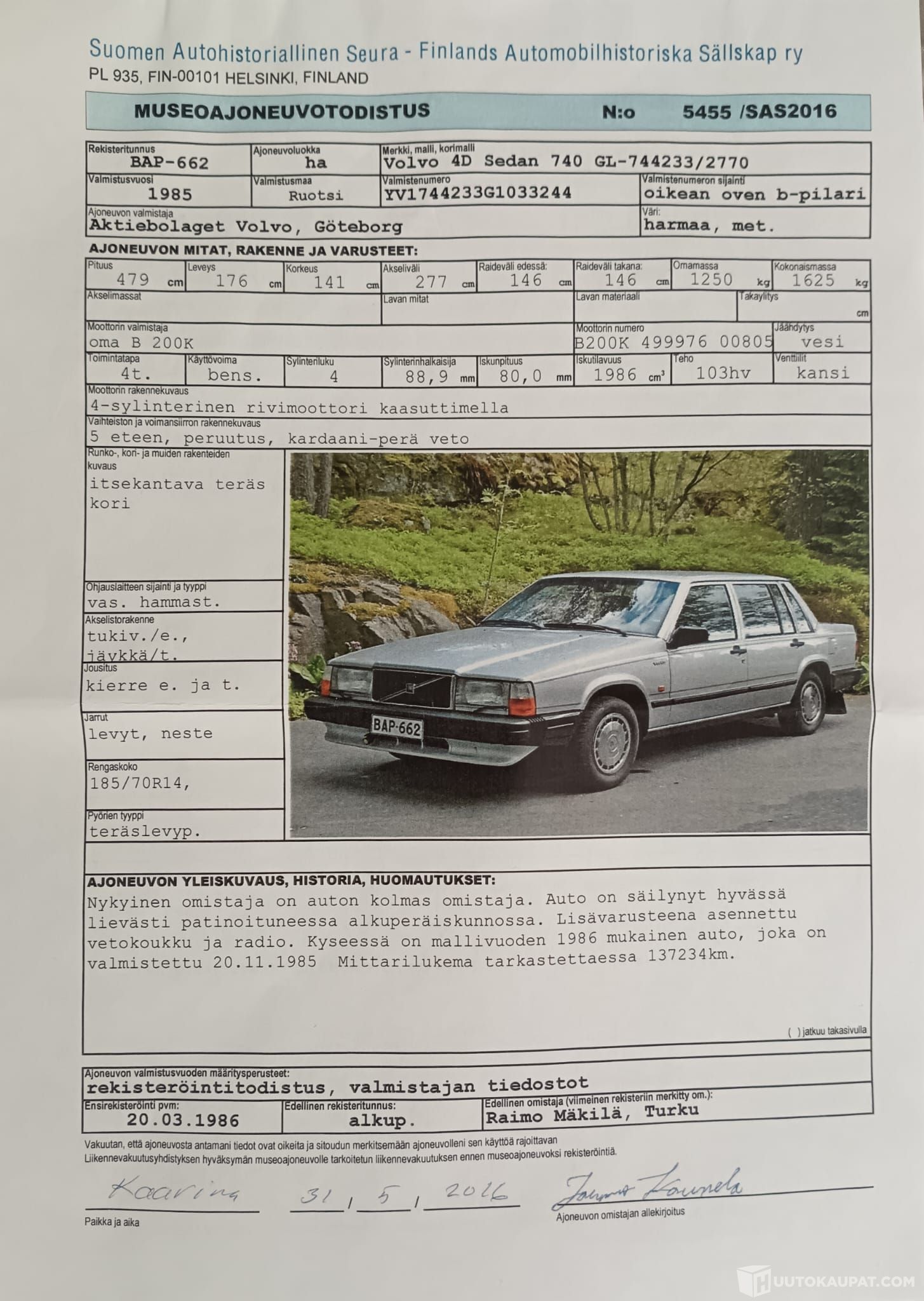 Museorekisterissä oleva Volvo 740 vm. 1986. Ajettu 139 544 km ja viimeiset 20 v ainoastaan kesäisin. Auto ollut samassa perheessä v. 1987 lähtien.