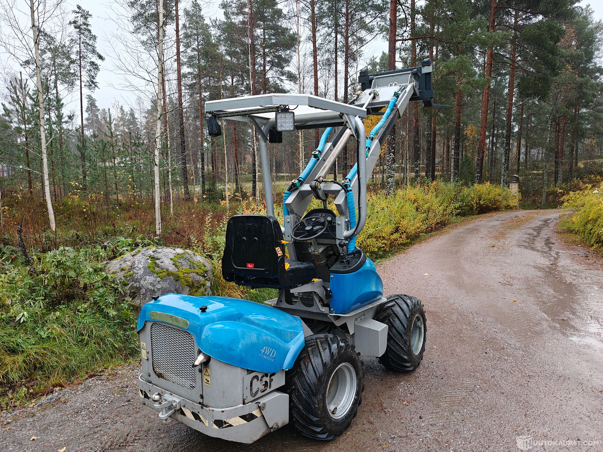 MultiOne SL25D pienkuormaaja. Alkuperäisen turvakaaren yhteyteen tehty katto, on siis muutamalla pultilla helposti irroitettavissa mikäli tarvetta. Kattorunkoon kiinnitetty myös vähintäänkin riittävästi työvaloja jotta näkee pimeälläkin ajella. Penkki myös uusittu hiljattain.