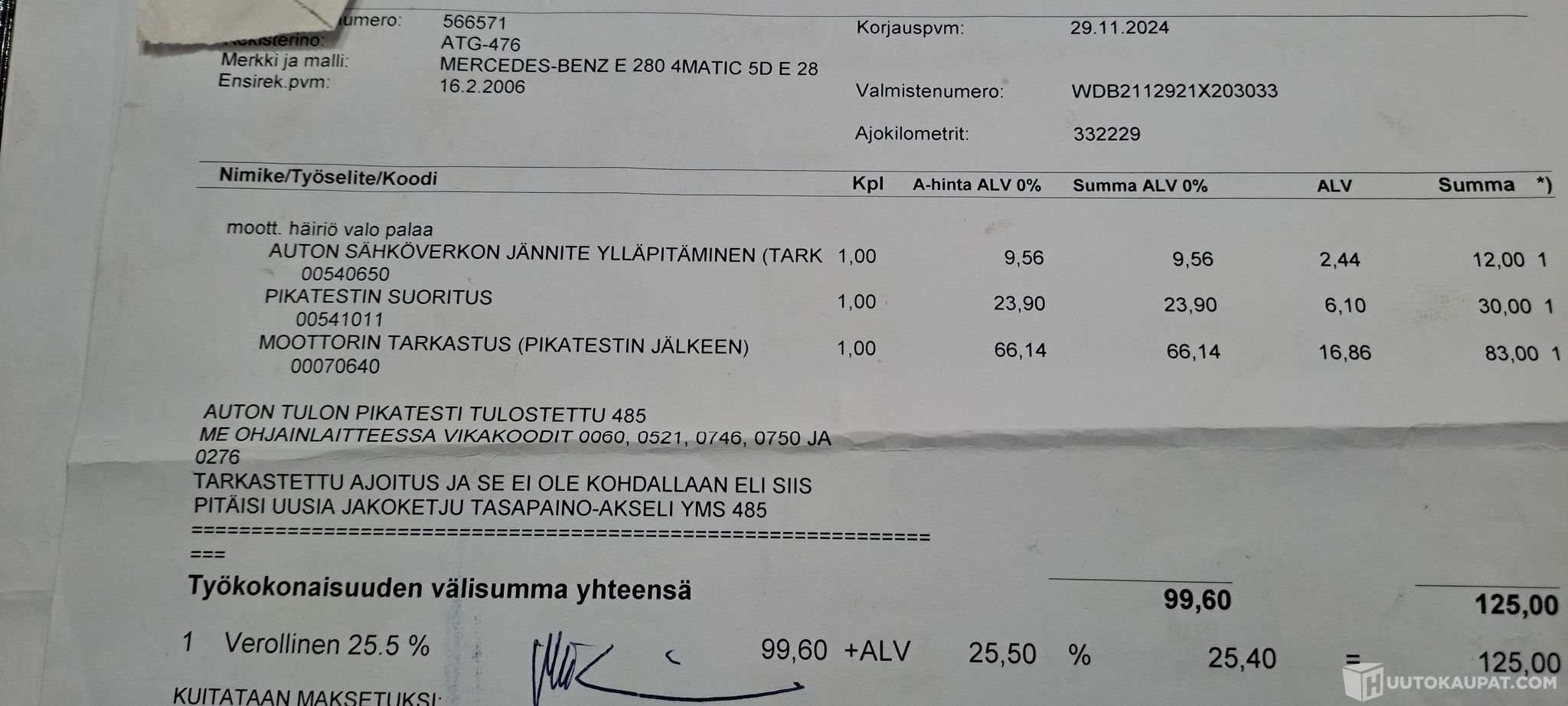 Tästä oikealla bensamoottorilla oleva nelikko Mercedes uuteen kotiin. Lyhyellä koeajolla auto tuntui toimivan eikä ylimääräisiä ääniä kuulunut. Marraskuulta 2024 mukana kuitti diagnoosista jossa maininta että jakoketju pitäisi uusia. Auto ei kyllä äännä erikoisesti ja käy ihan normaalisti ainakin kylmänä. Perimätiedon mukaan ketju vika korjattu ja samalla uusittu ilmajousen pussit perään, mutta vika ei ole korjaantunut. Vuotaa jostakin muualta kun kompura kuitenkin toimii. SRS (turvatyynyjärjestelmä) merkkivalo palaa eikä sitä ole tutkittu sen tarkemmin mistä johtuu. Tuulilasi alhaalta halki.