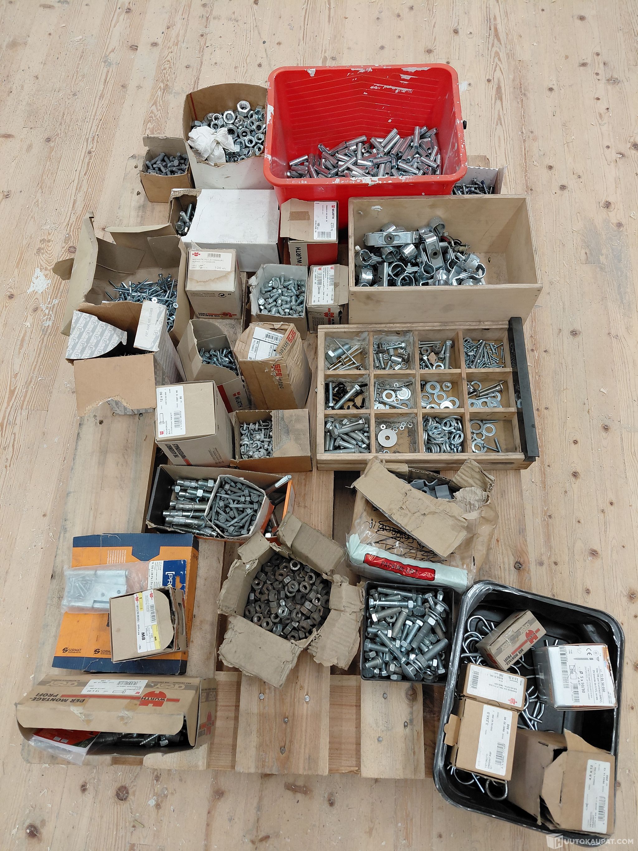 Rikosseuraamuslaitos myy Oulun vankilasta tarpeettomana, kuvissa näkyvät kiinnitys tarvikkeet. Paketeissa vaihteleva määrä erilaisia ruuveja, muttereita, proppuja, konenauloja ym.