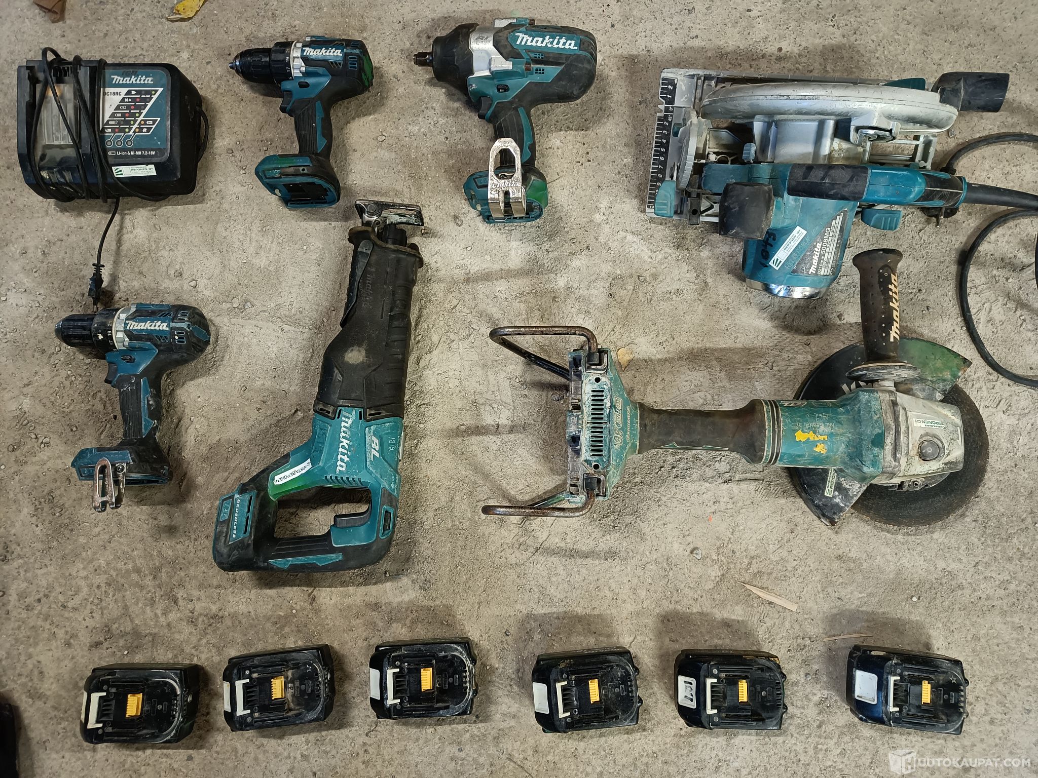 Akkuporakone 2 kpl, käsisirkkeli 1 kpl, puukkosaha 1 kpl, pulttipyssy 1 kpl (DTW1002), iso rälläkkä 1 kpl. Mukana akut, yksi laturi ja Makitan kass