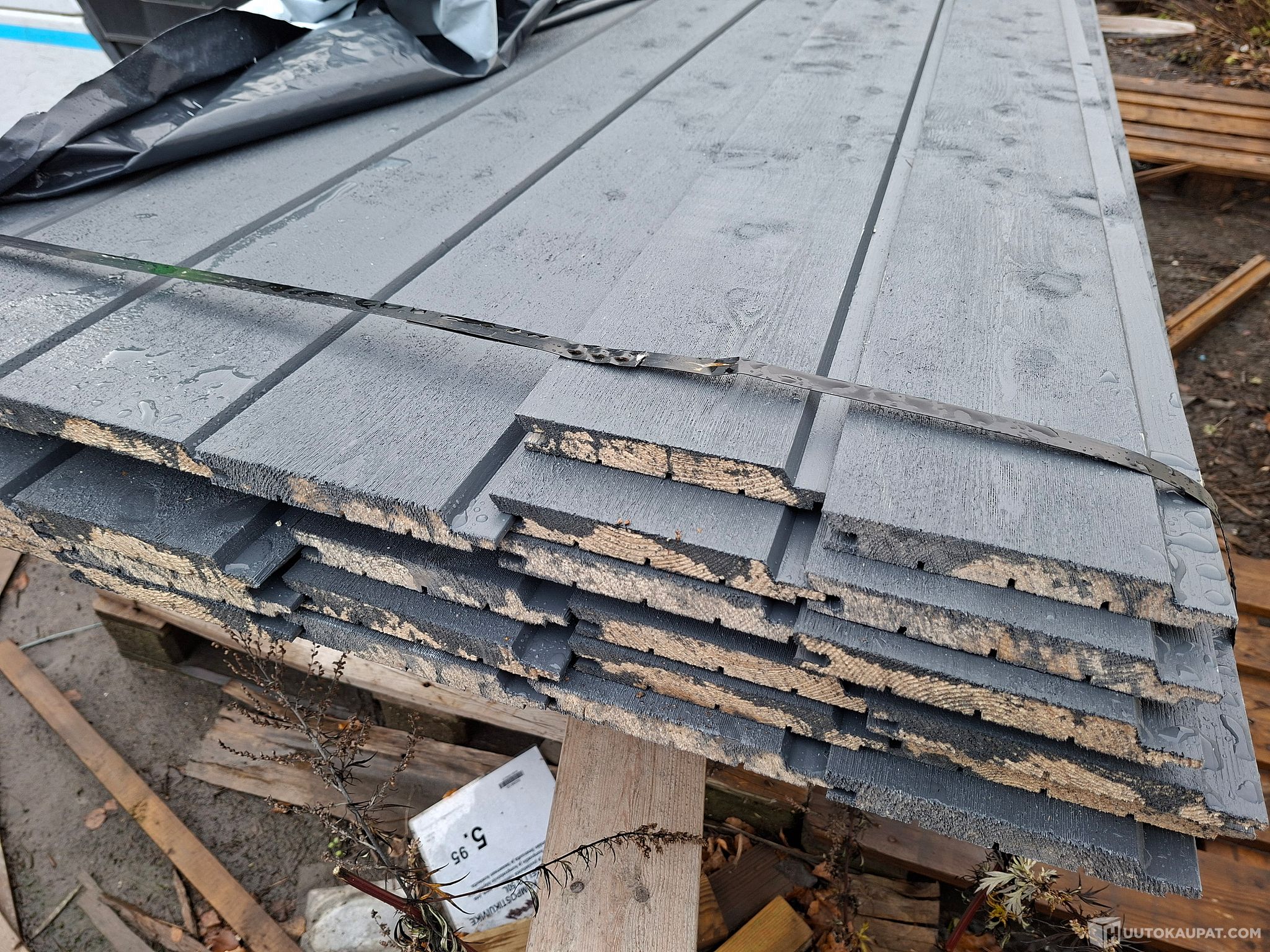 32 kpl 4,5 m pitkiä valmiiksi tehdasmaalattuja (pohja+kaksi pintamaalausta) ulkoverhouspaneeleja. Kokonaismäärä 144 m.