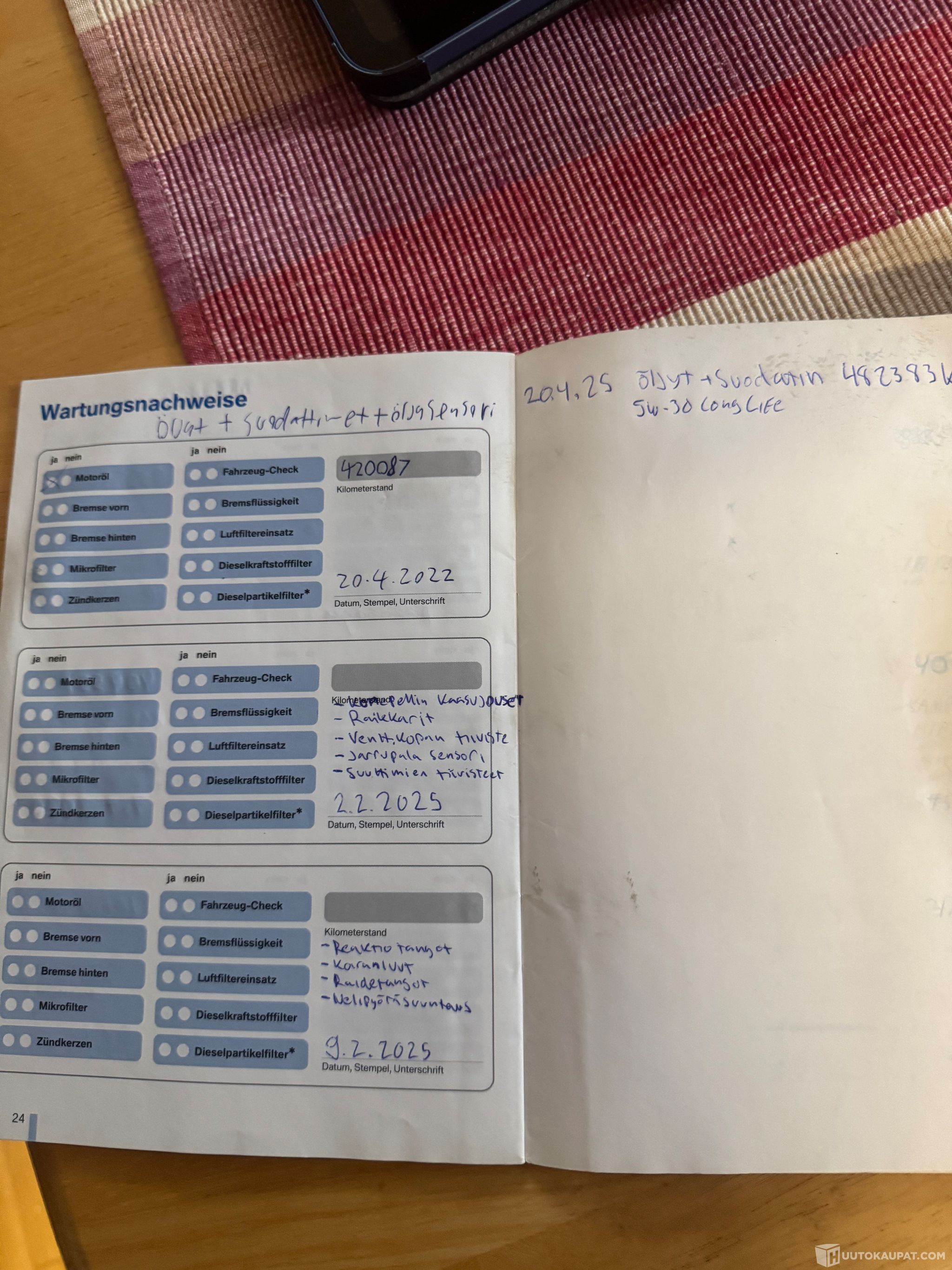 Viimeisin huolto: 20.08.2025 (ajomäärä 491 383 km)