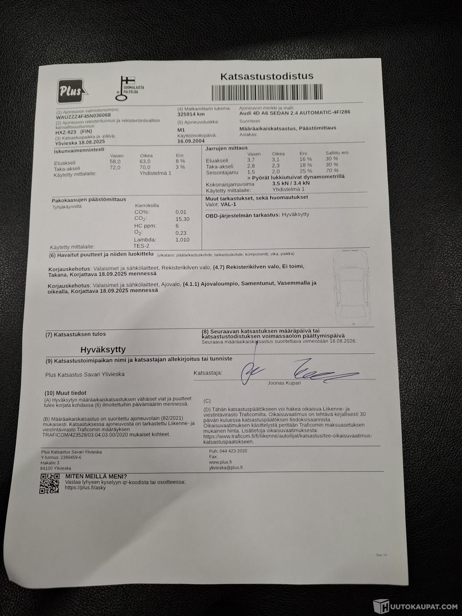 Auto ei ole ollut toimestamme teknisessä kuntotarkastuksessa eikä kaikkien varusteiden