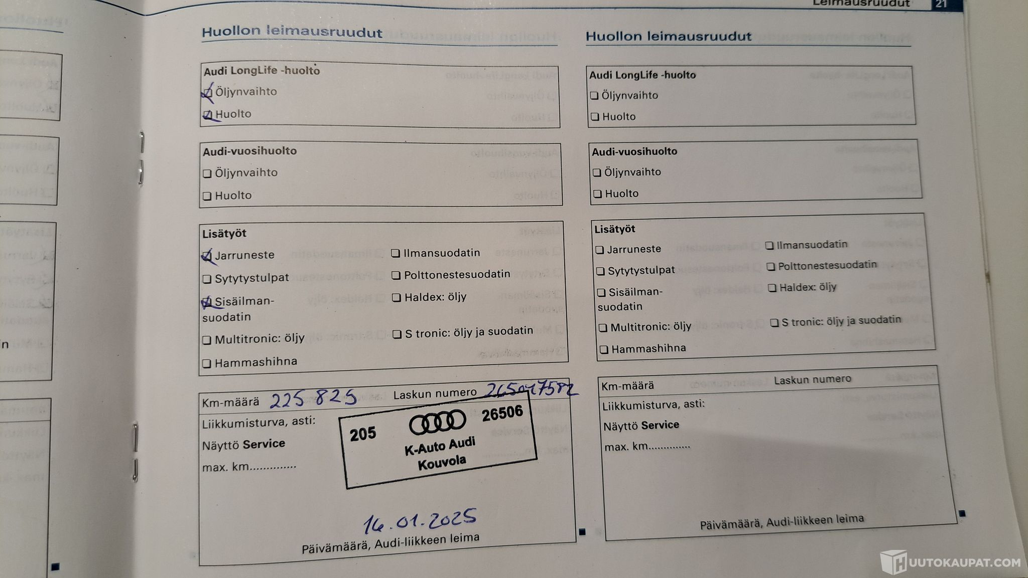 Huoltokirja - Viimeisin huolto tehty 01/2025/225tkm