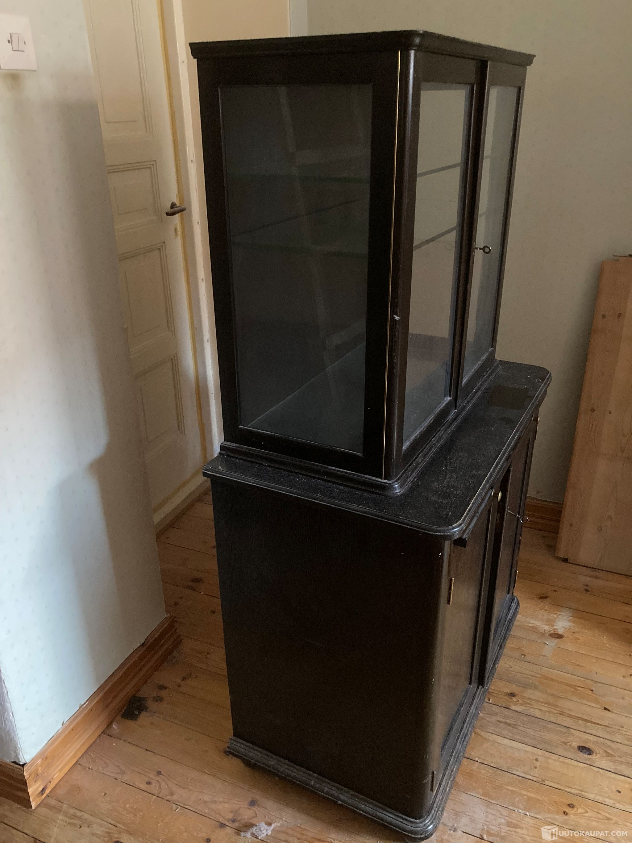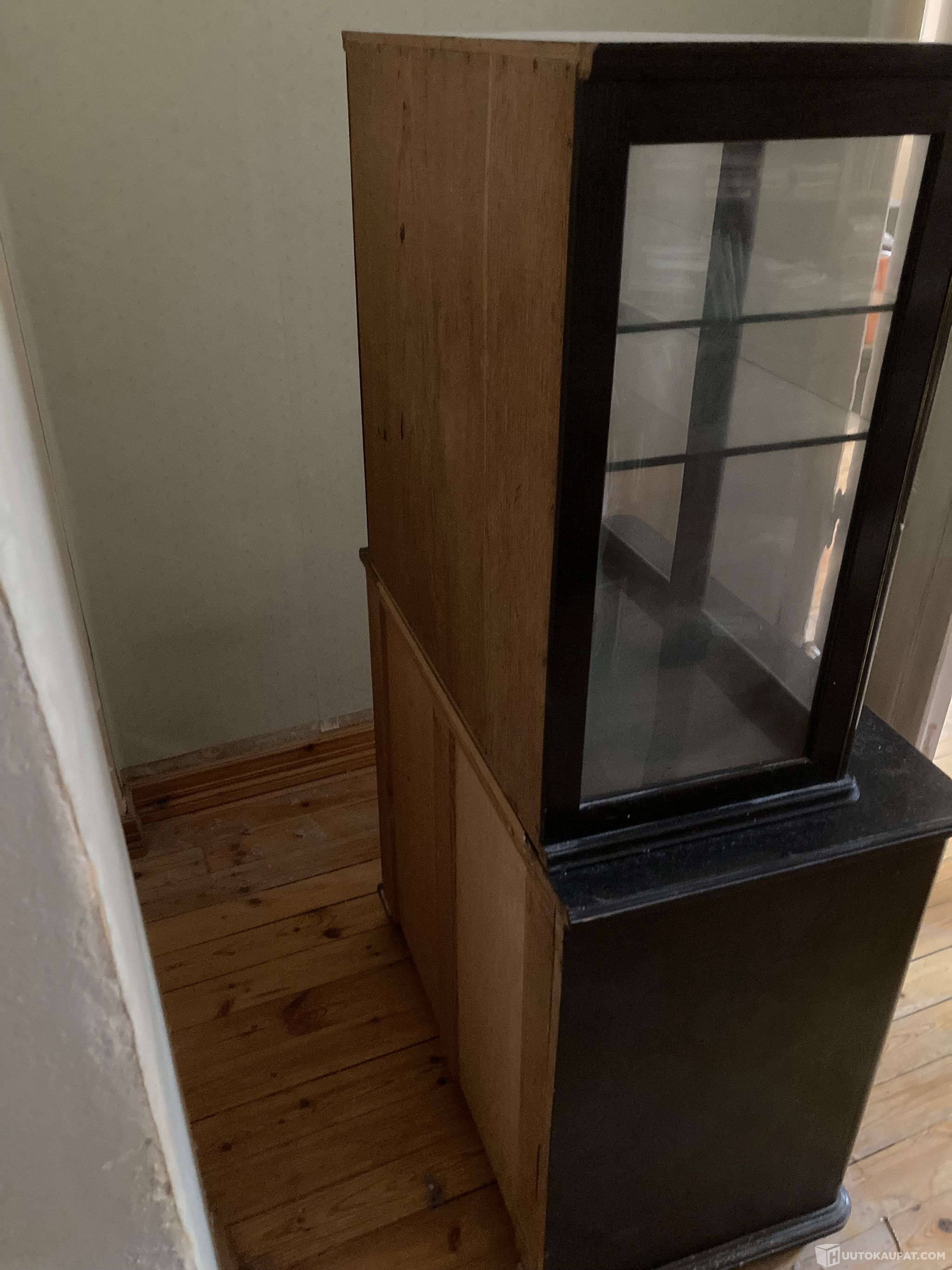 Tyylikäs vintage henkinen vitriinikaappi 1920-luvulta. Erillinen ylä ja alaosa. Tummaruskea alkuperäinen lakkapetsaus. Alkuperäiset lasit. Hienot yksityiskohdat. Ajalta, jolloin huonekalut tehtiin laadukkaasti ja aikaa kestäväksi. Korkeus 150 cm, leveys leveimmillään 85 cm ja syvimmillään syvyys 55 cm. On tosi hieno vintage kaappi.