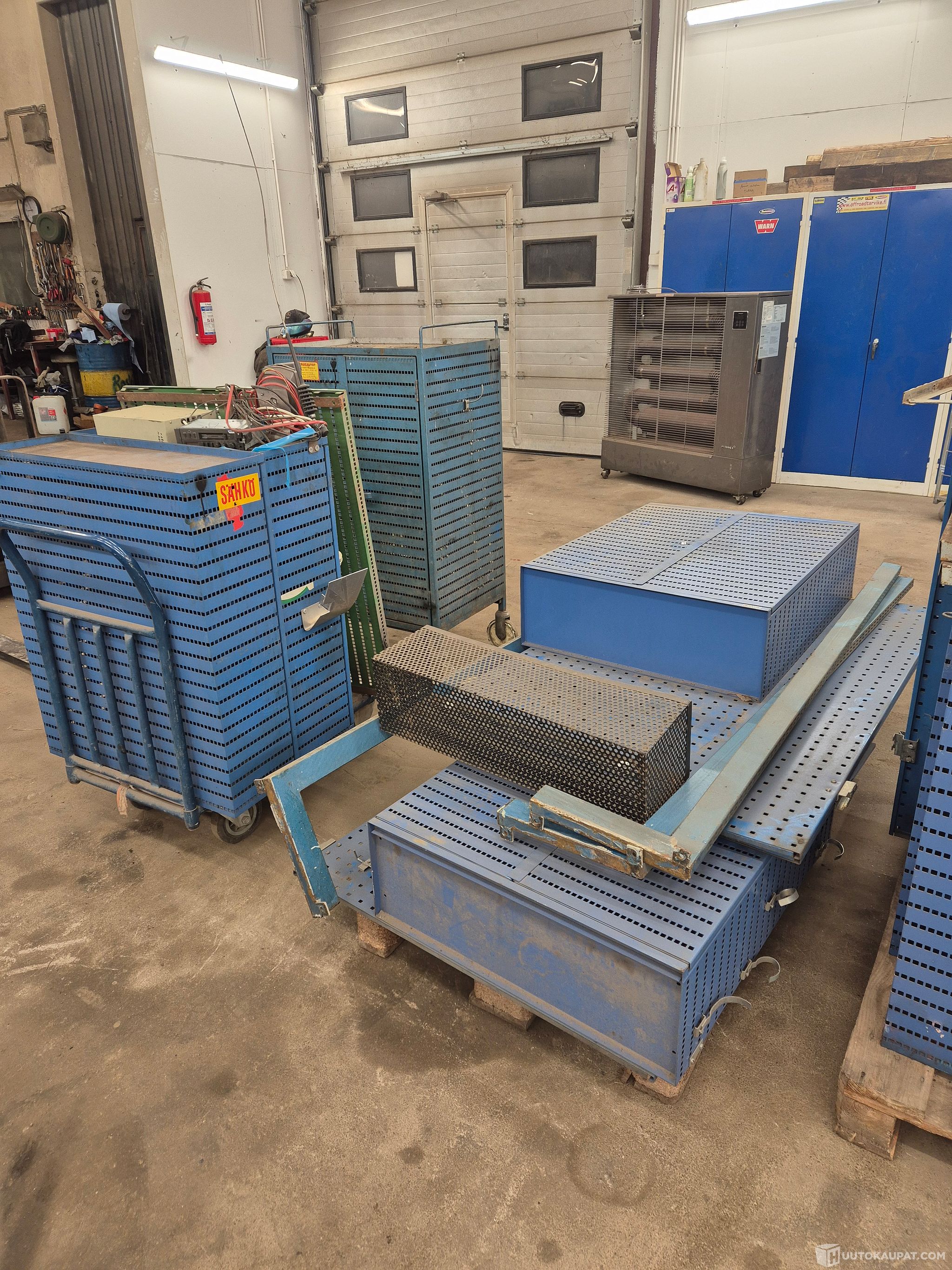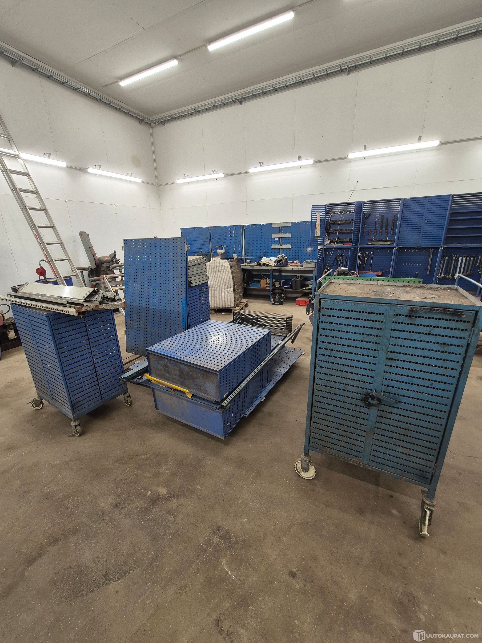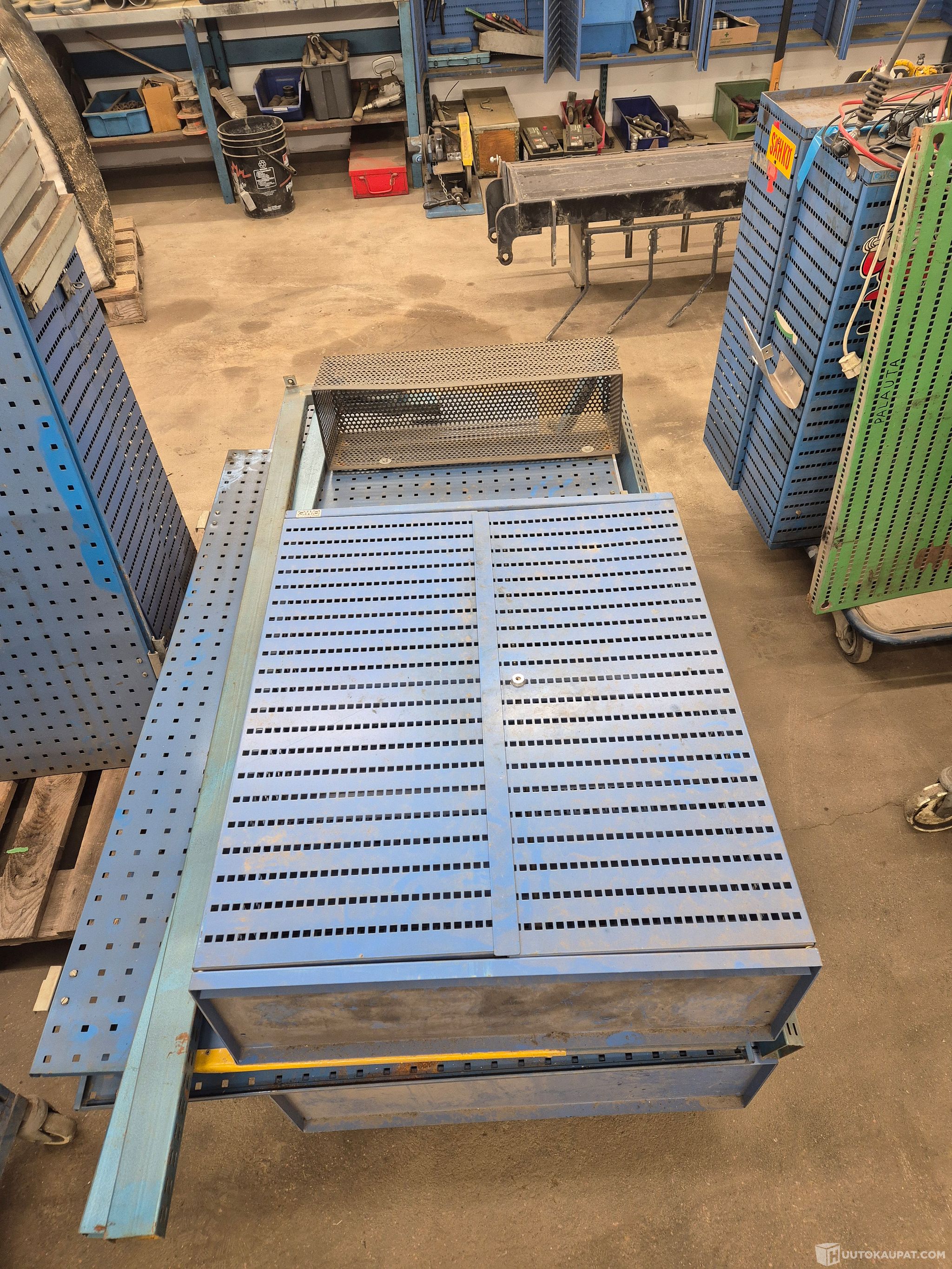 Käytöstä poistettuja GWS kaappeja ja reikälevy seiniä , niihin kuuluvia jalkoja , yksi muun merkkinen työkalukaappi jossa 1 rengas rikki , kaappeihin löytyy avain