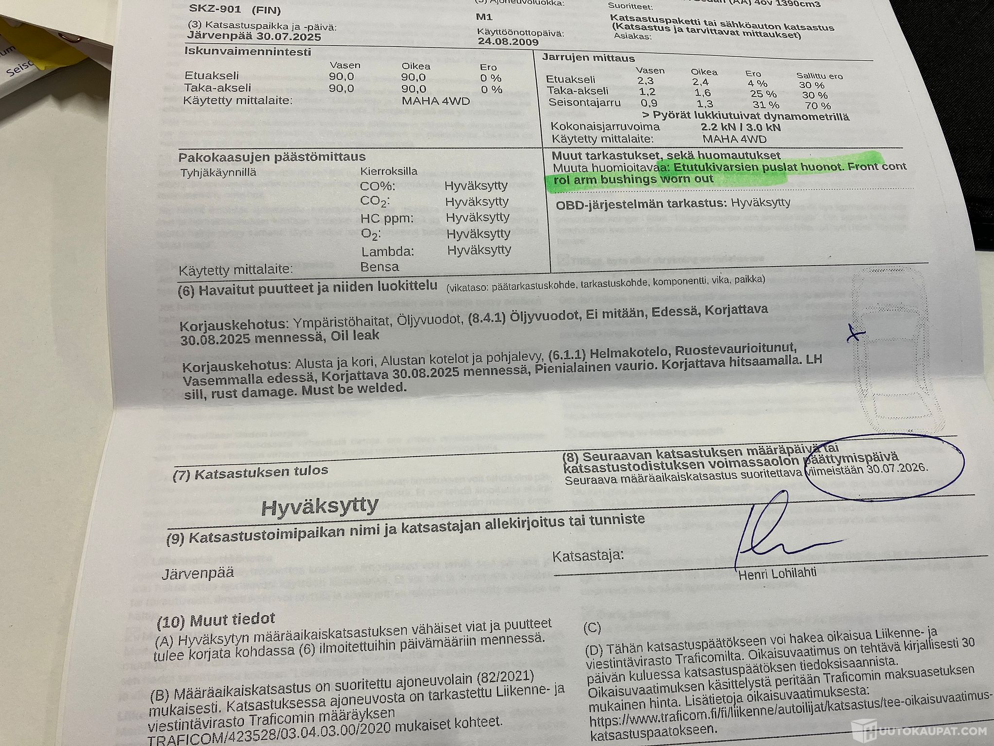 Kuvissa katsastuslappu jossa korjauskehotukset, ei tietoa onko korjattu.
