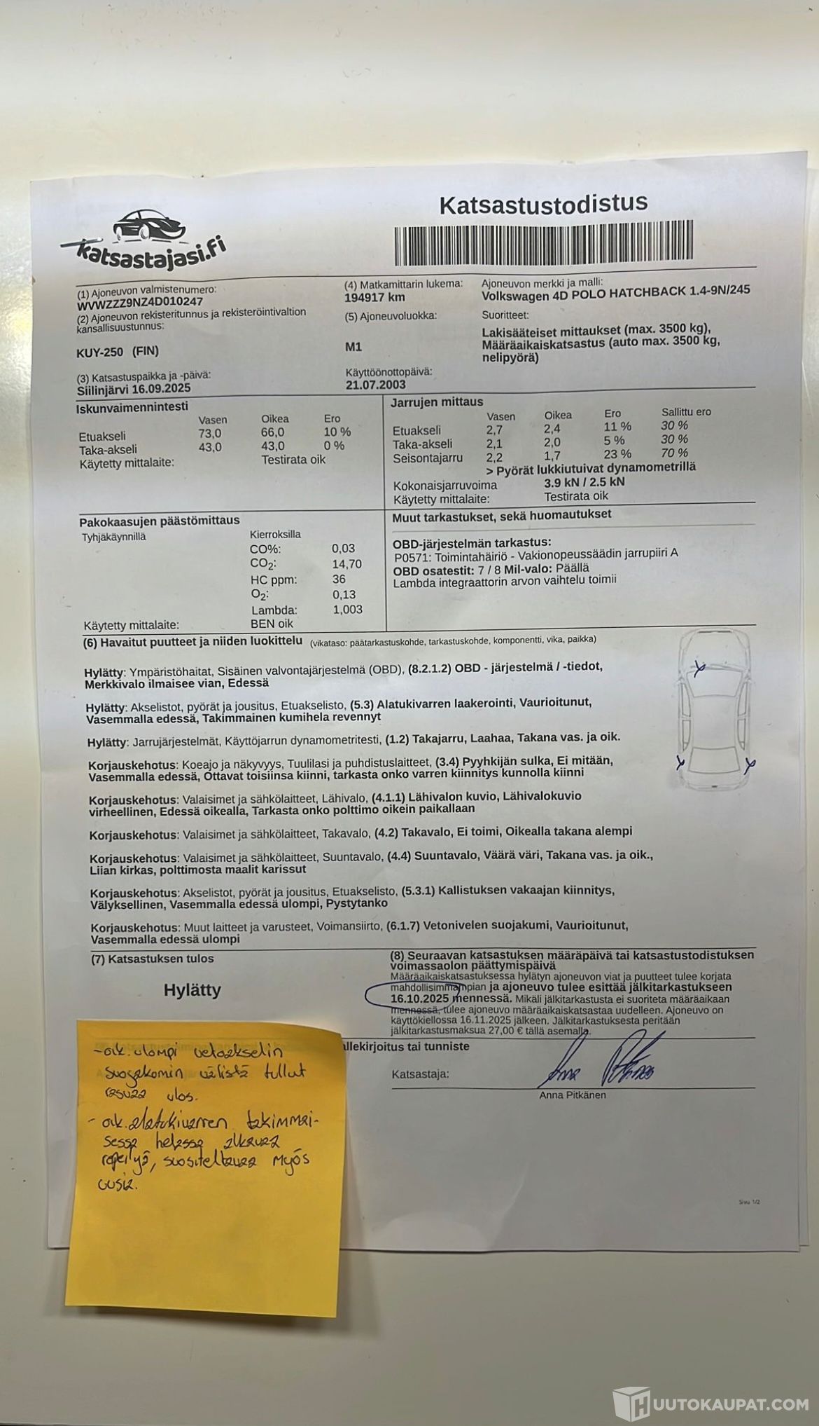 Katsastuksen ajoaika 16.11.2025 loppuun. Kuvissa hylkäyssyyt.