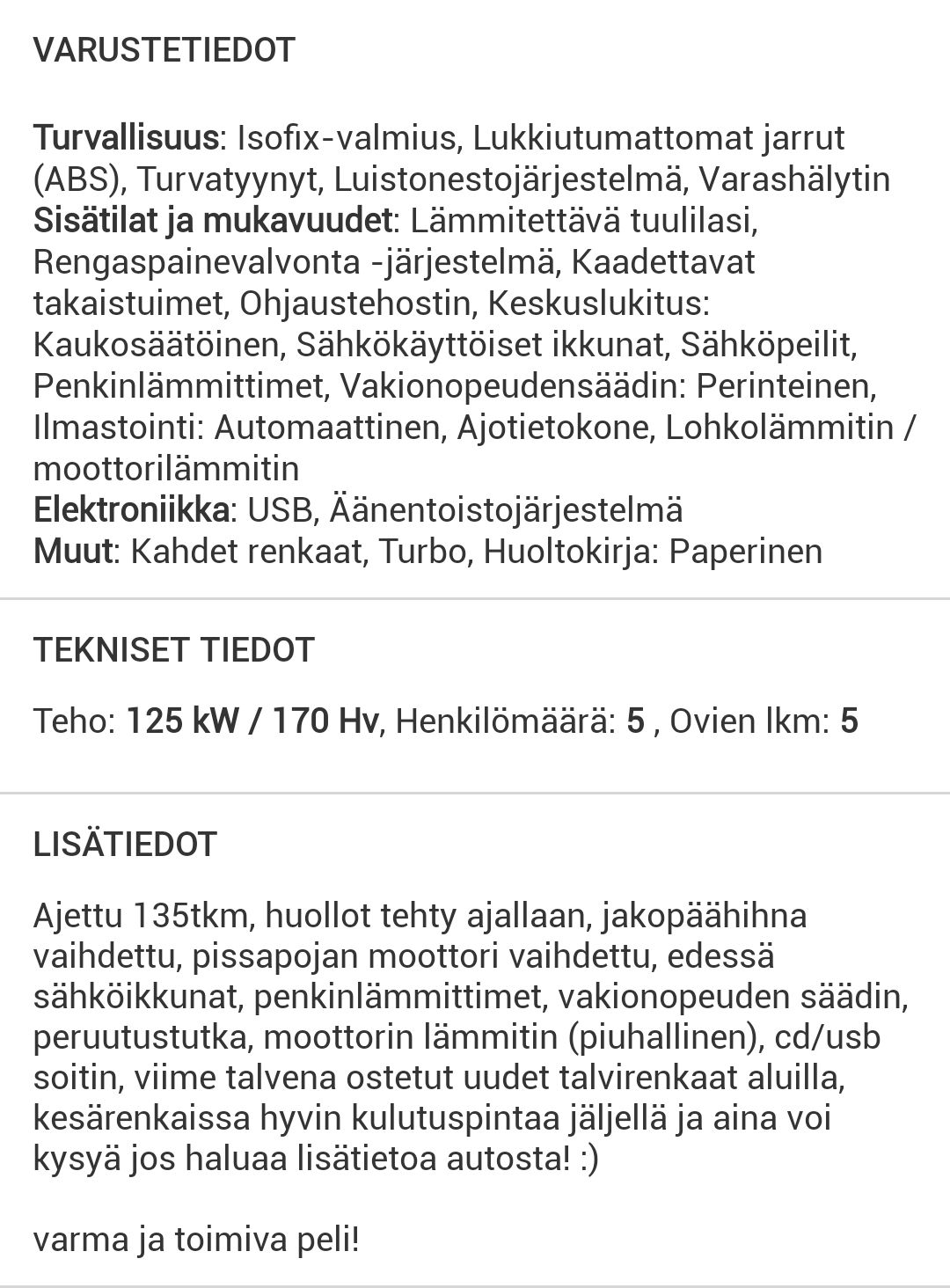 Jos olet kiinnostunut autosta, ole ystävällinen ja tarkista näiden hinnat Nettiautosta – se antaa osviittaa, mihin summaan toivoisin pääseväni. Muuten autosta saa rohkeasti kysyä ja soittaa!