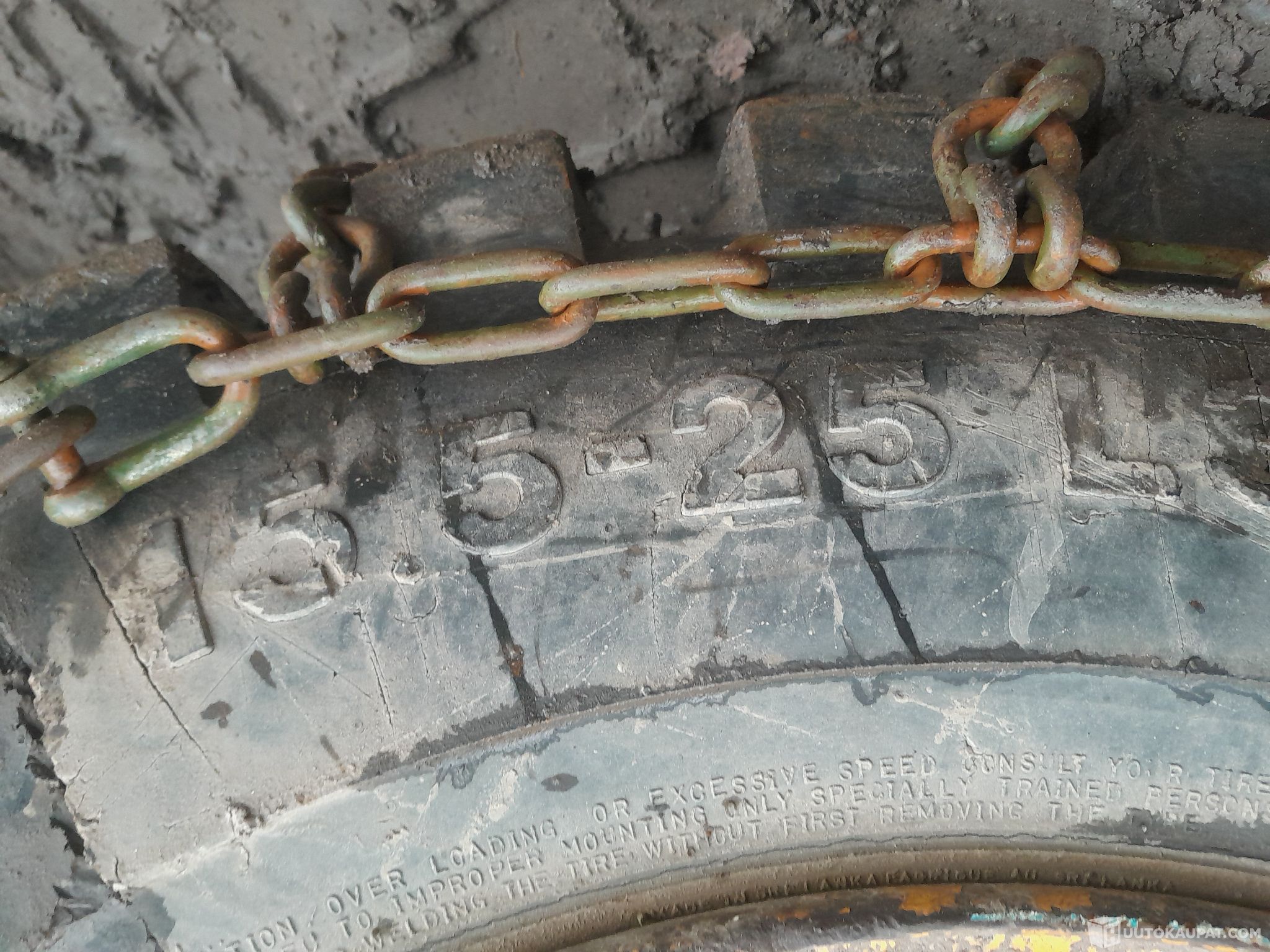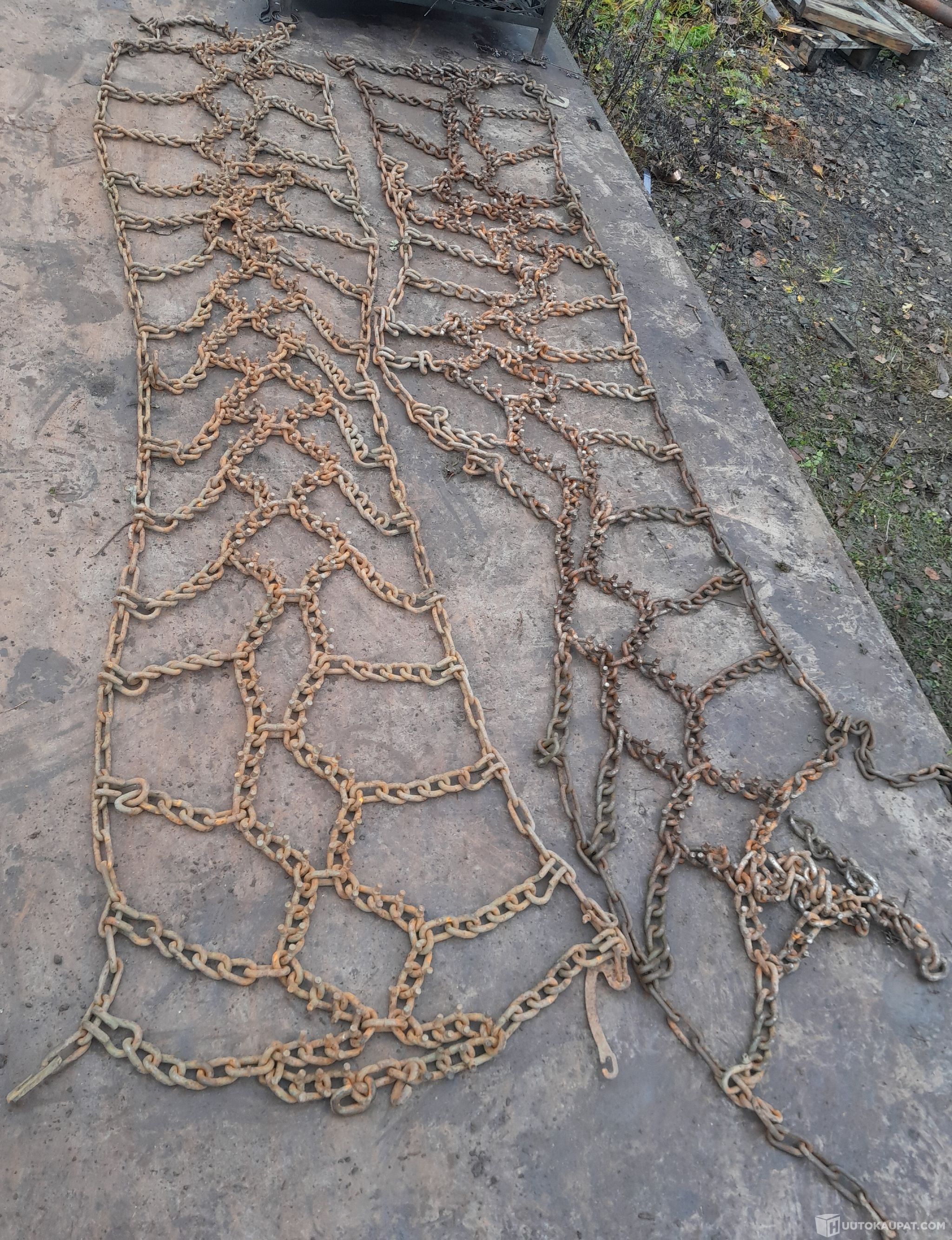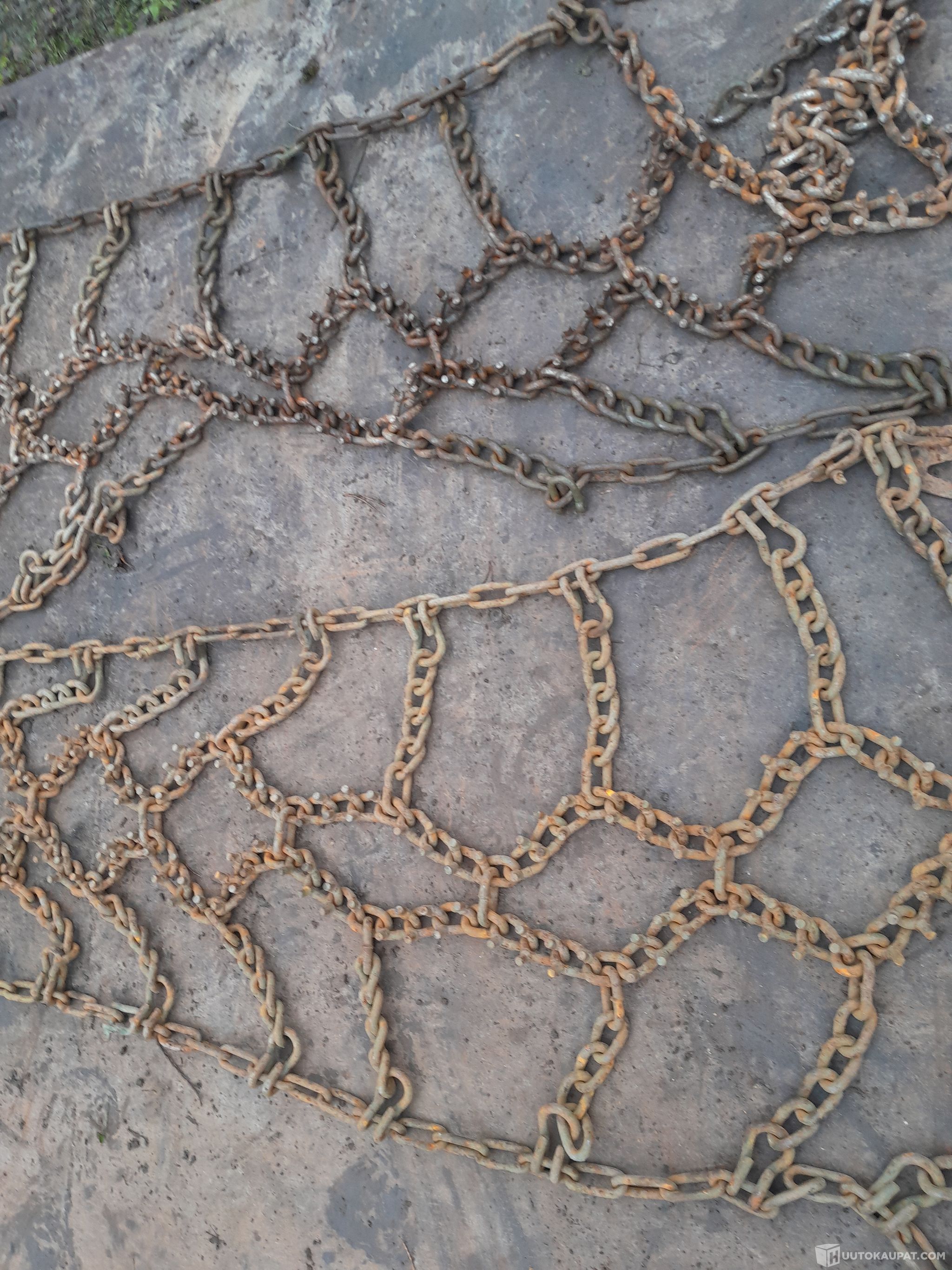 Lähes uudenveroiset lumiketjut. Sopii ainakin renkaille jonka ulkohalkaisija 120cm ja leveys 40cm / ulkohalkaisija 121cm ja leveys 35cm.