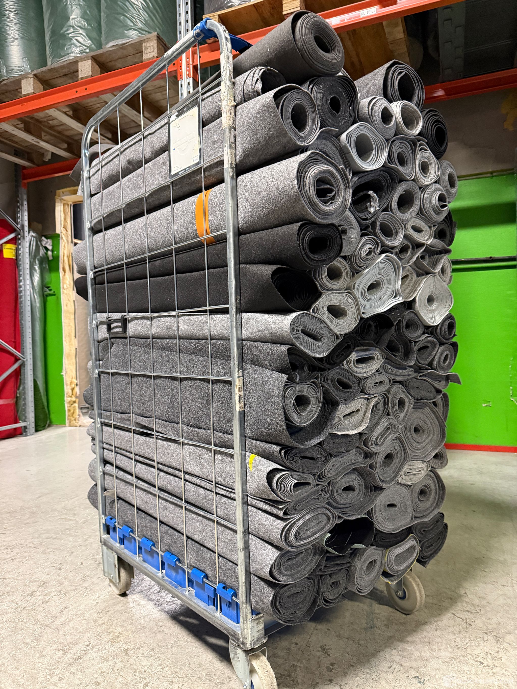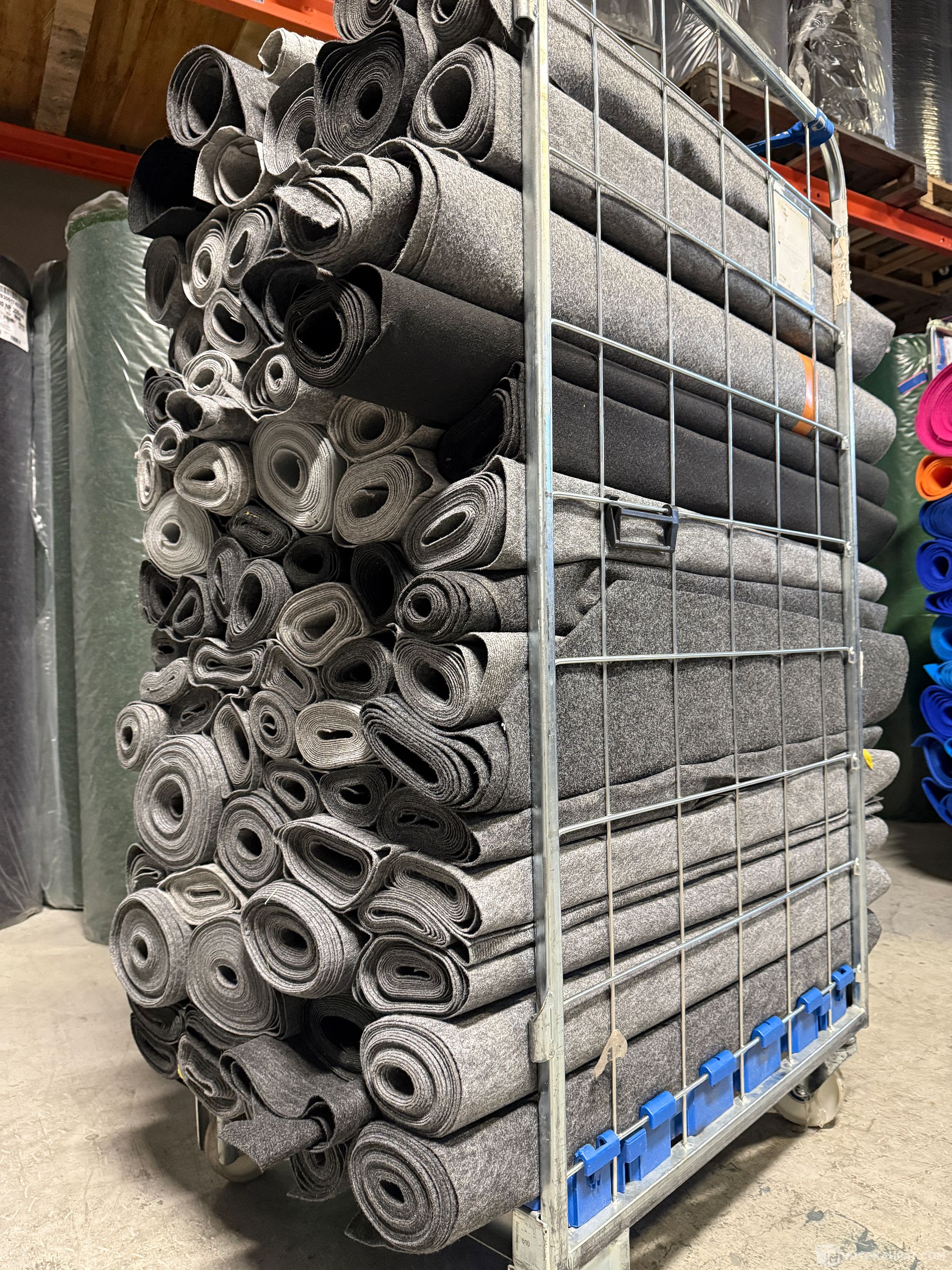 Korkea ja ylipakattu rullakollinen käytettyä ja supersuosittua harmaata käytettyä messumattoa n. 1 metriä leveissä ja siisteissä kaistaleissa.