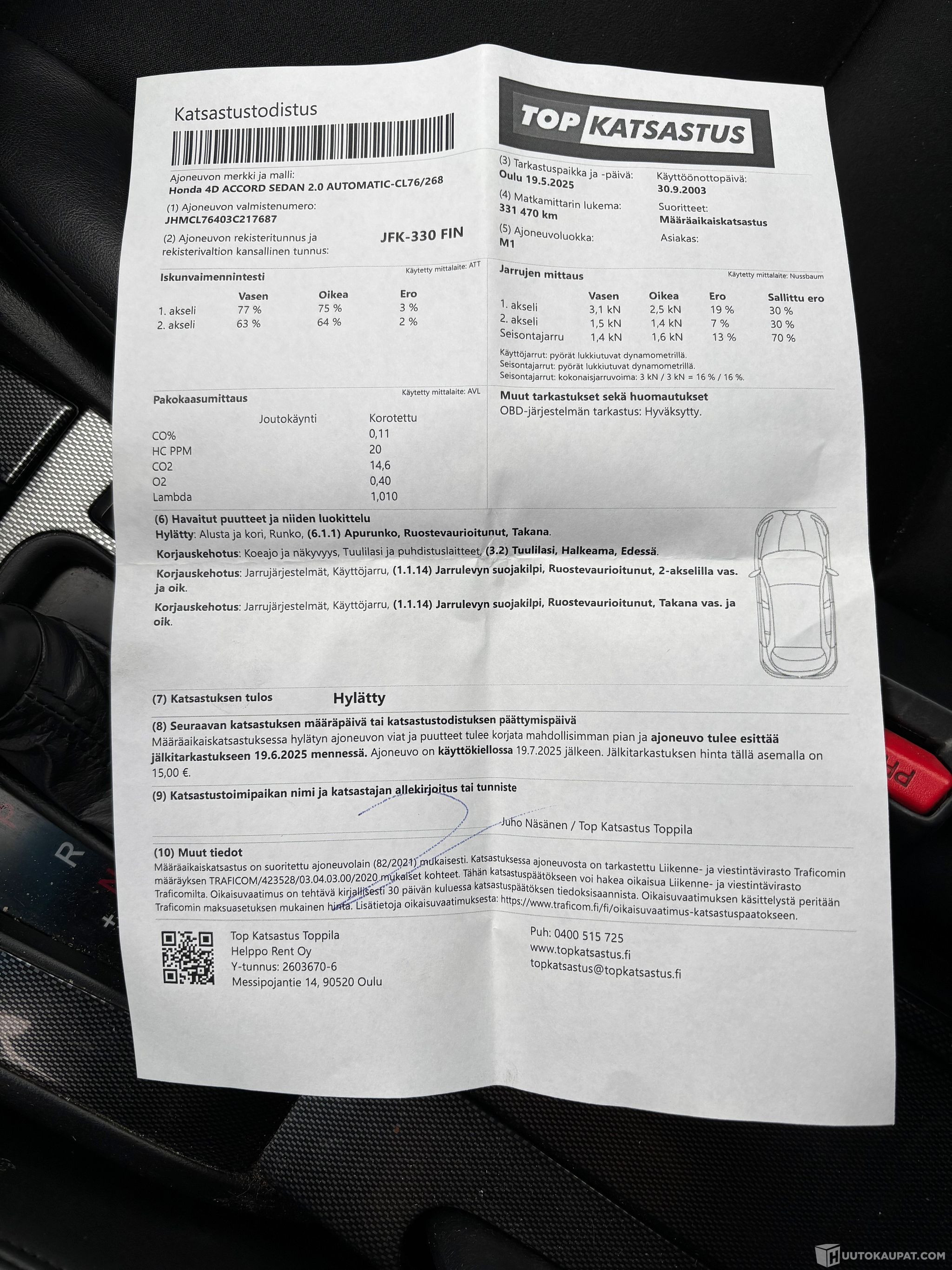 Hylätty katsastuksessa 6/2025 (taka-apurunko ruostunut/pitäisi vaihtaa. Korjauskehotus/tuulilasin hakeama & ruoste vauriot (näkyy kuvissa).