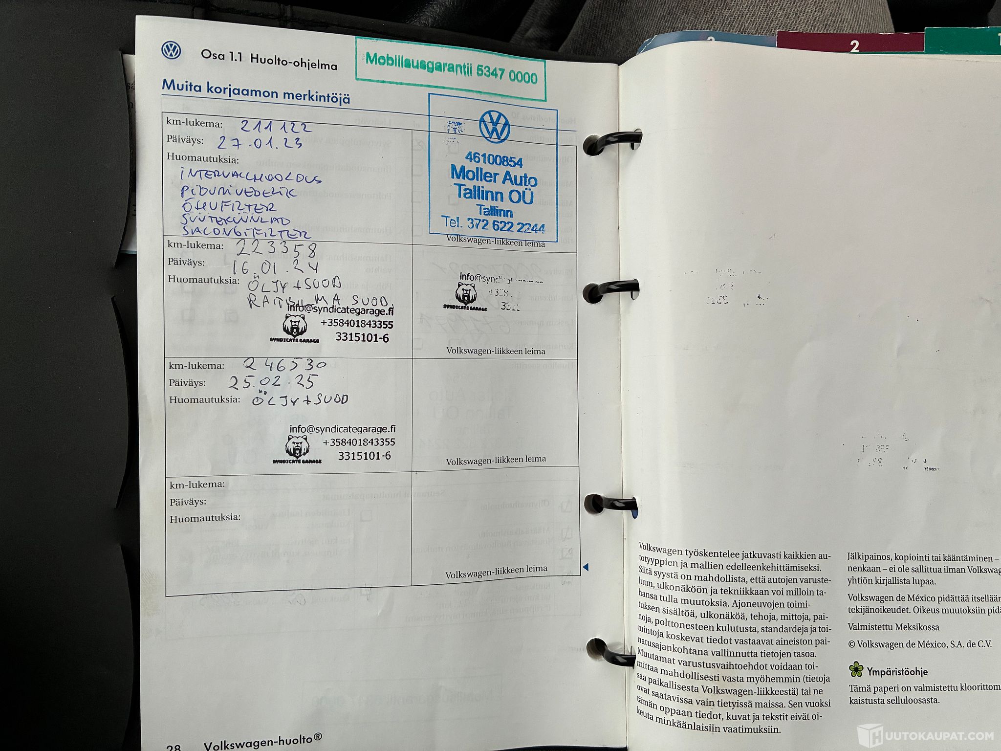 Huoltokirjan tiedot löytyvät kuvista.