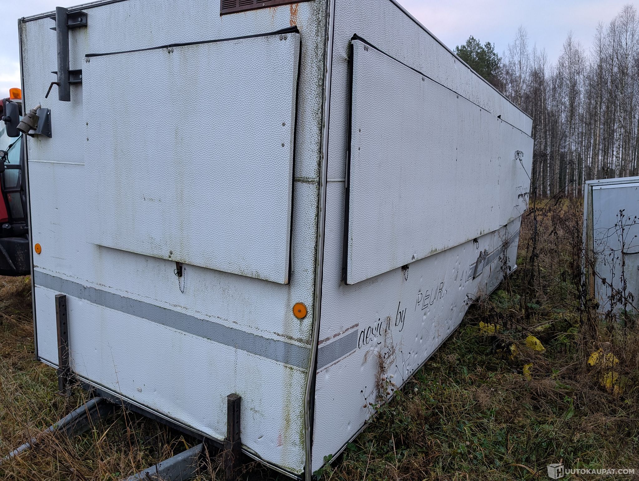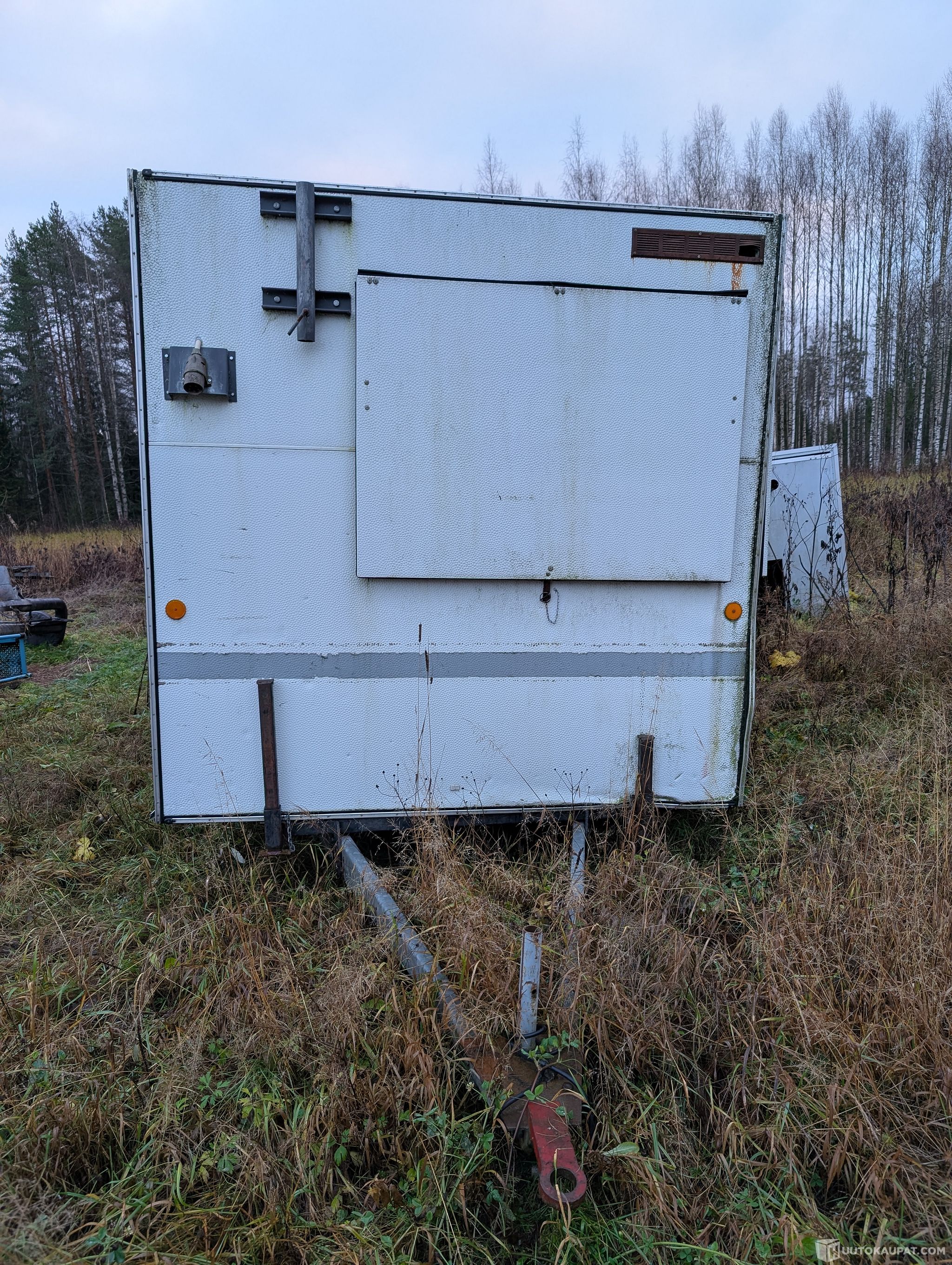 Traktorilla hinattava iso toimitsijakoppi. Alustan pitäisi olla ehjä, itse koppi on yhdeltä seinältä ja katolta antanut perään, näkyy kuvissa.