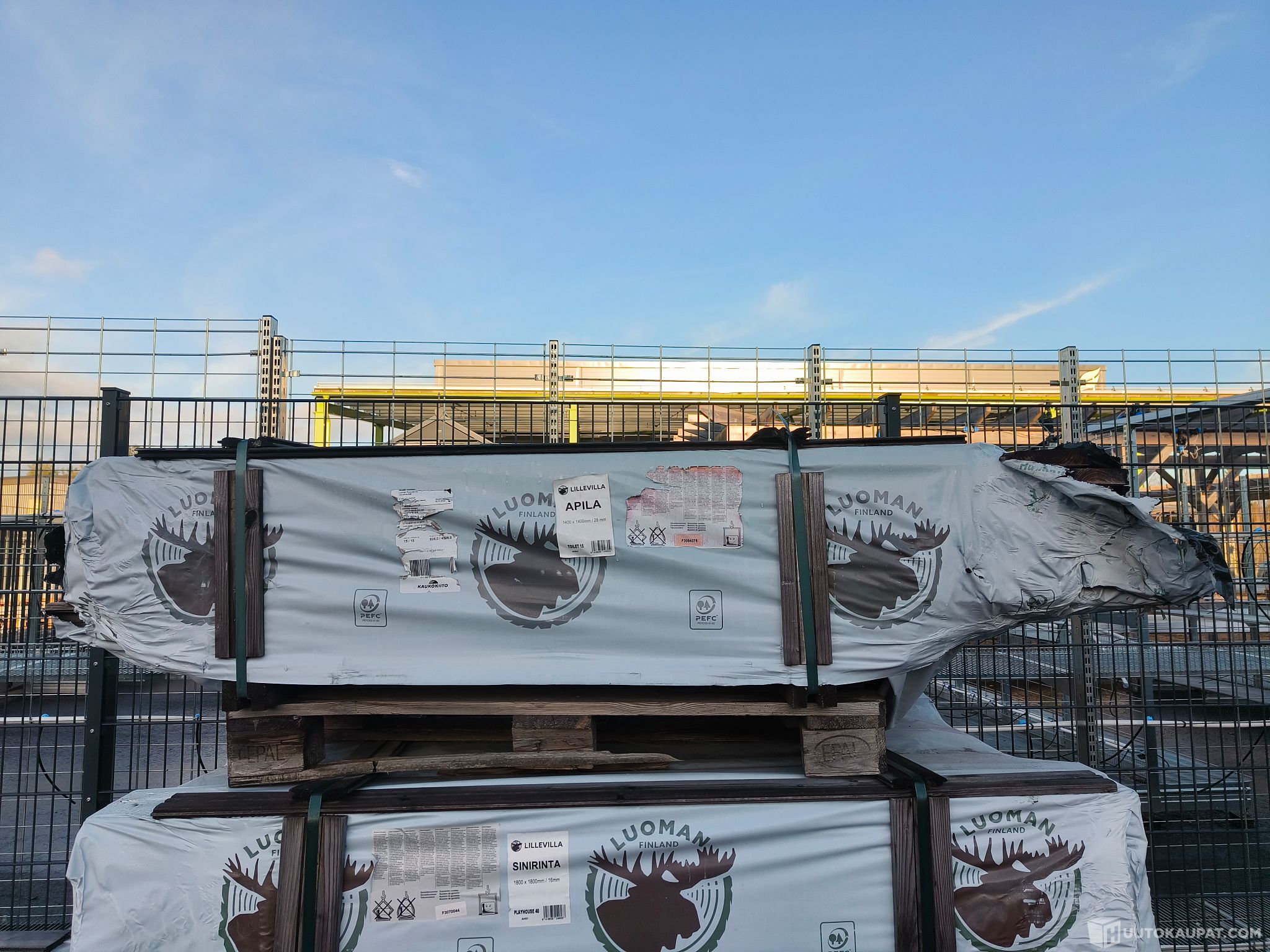Paketin muovi revennyt hiukan ja muutama puuosa saanut kosteutta. Näkyy kuvissa.
