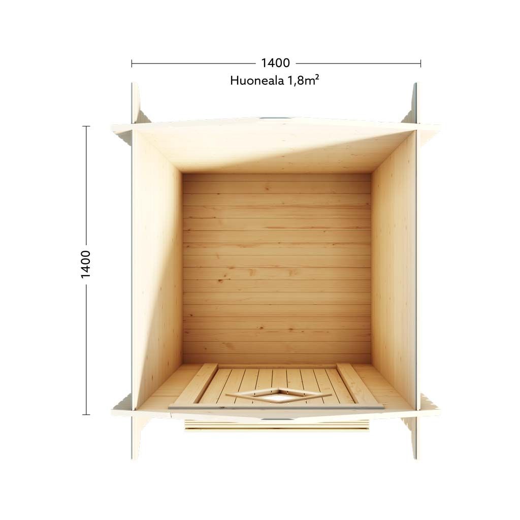 Pohjan ala (m²) 2, Pohjan koko (mm x mm) 1400 x 1400, Seinävahvuus (mm) 28, Kattokaltevuus (astetta)18,00, Sivuseinän korkeus (mm)2230, Harjakorkeus (mm)2600