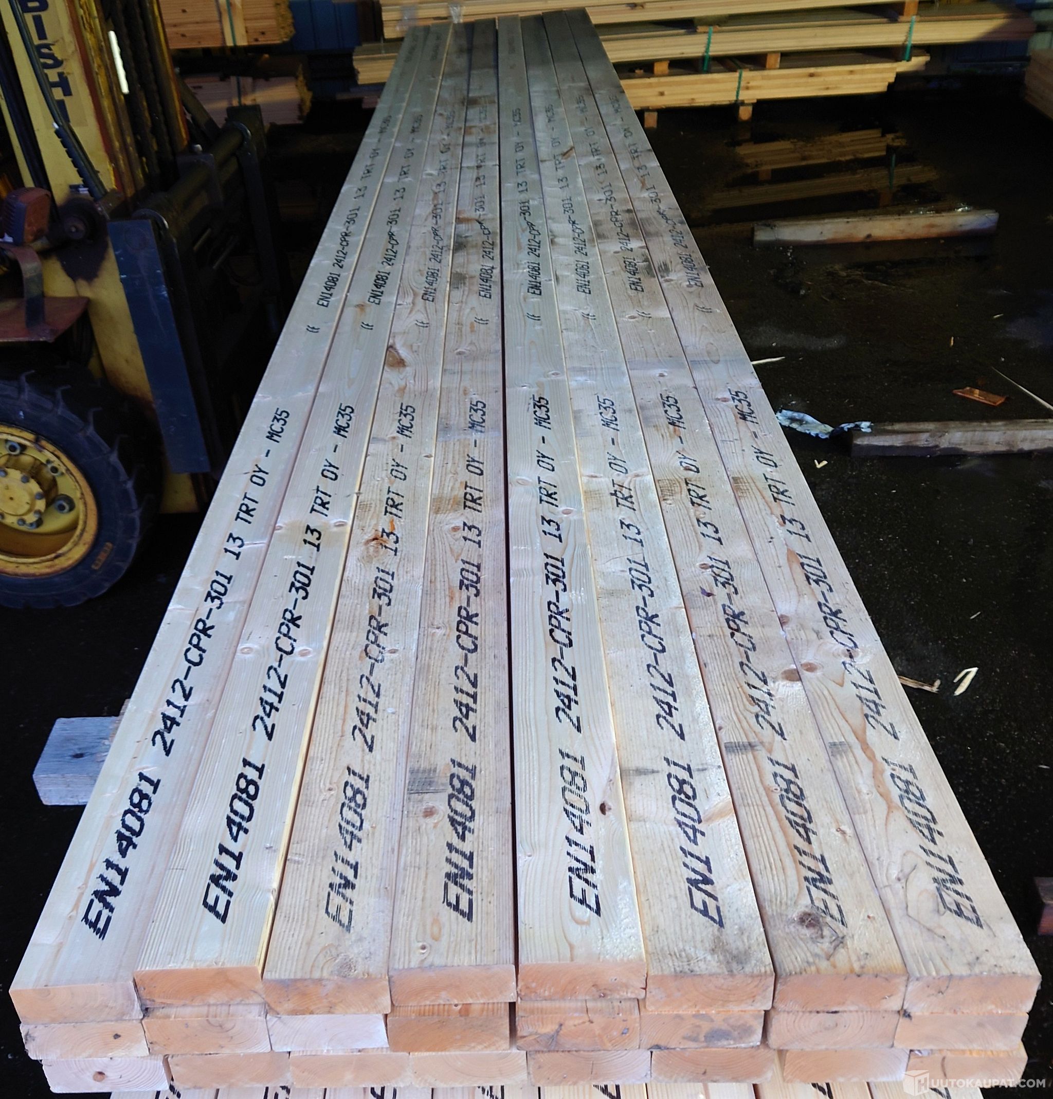 Kuvissa näkyvä 24 kpl erä koneellisesti lujuuslajiteltuja mitallistettuja "kuusipattinkeja" 42x95 mm. Kaikki ovat 5,4 m pitkiä ja hyvälaatuisia soiroja. 23 kpl ovat lujuusluokkaa MC 35 ja yksi MC 30. Käyvät siis vaativaankin rakentamiseen.