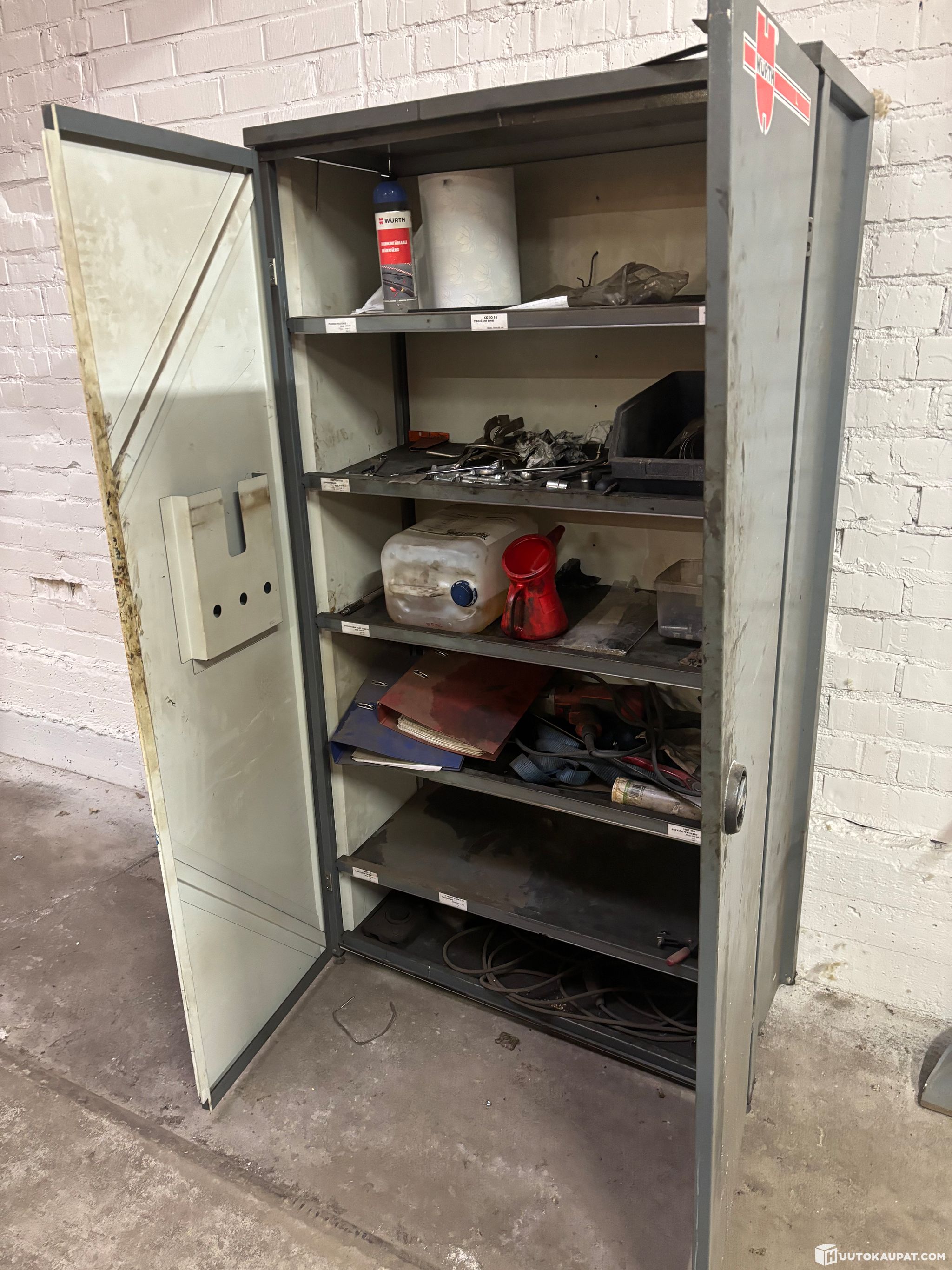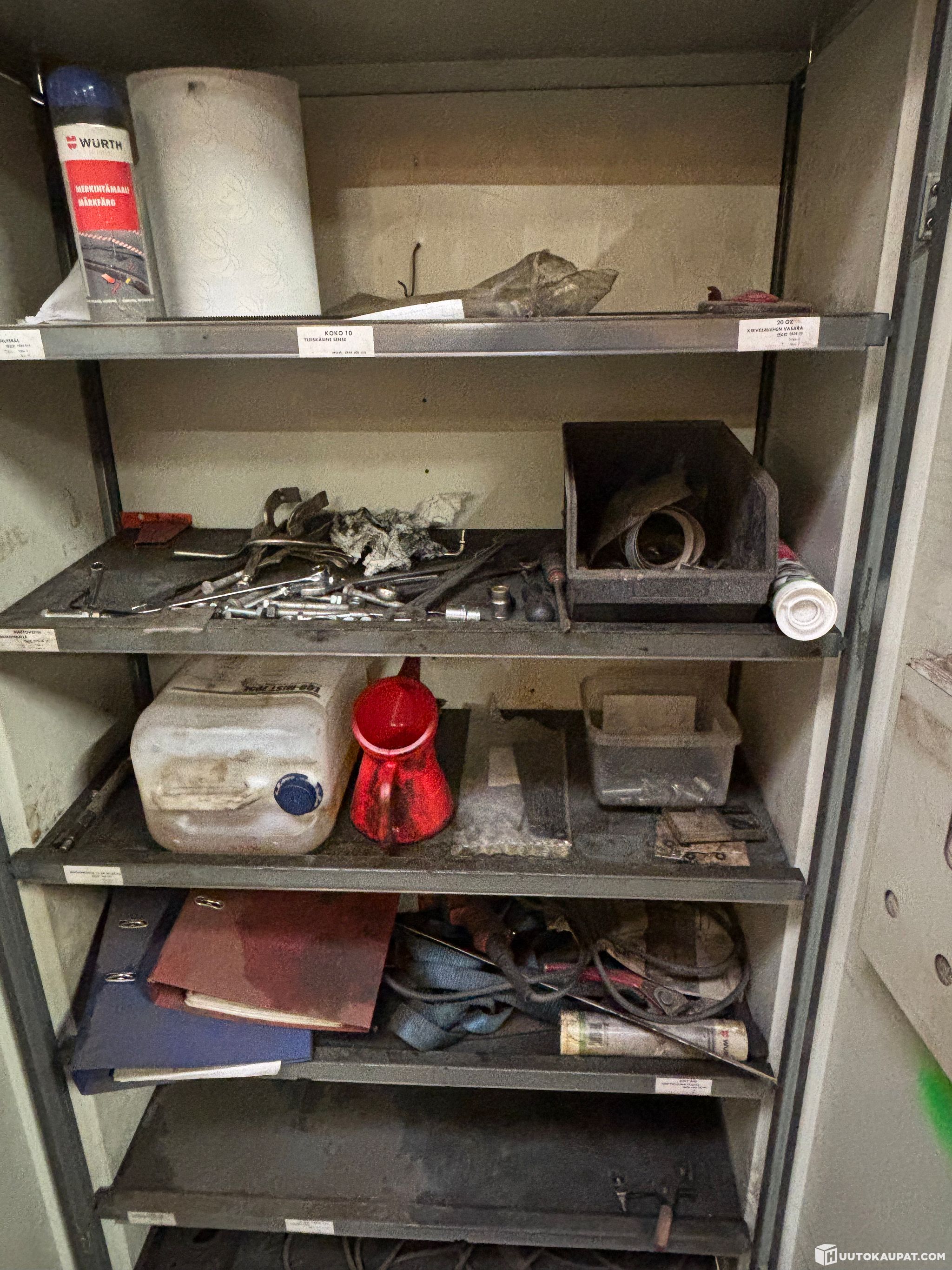 Metallikaappi sisältöineen, syv 40 cm, lev. 105 cm, kork. 180 cm