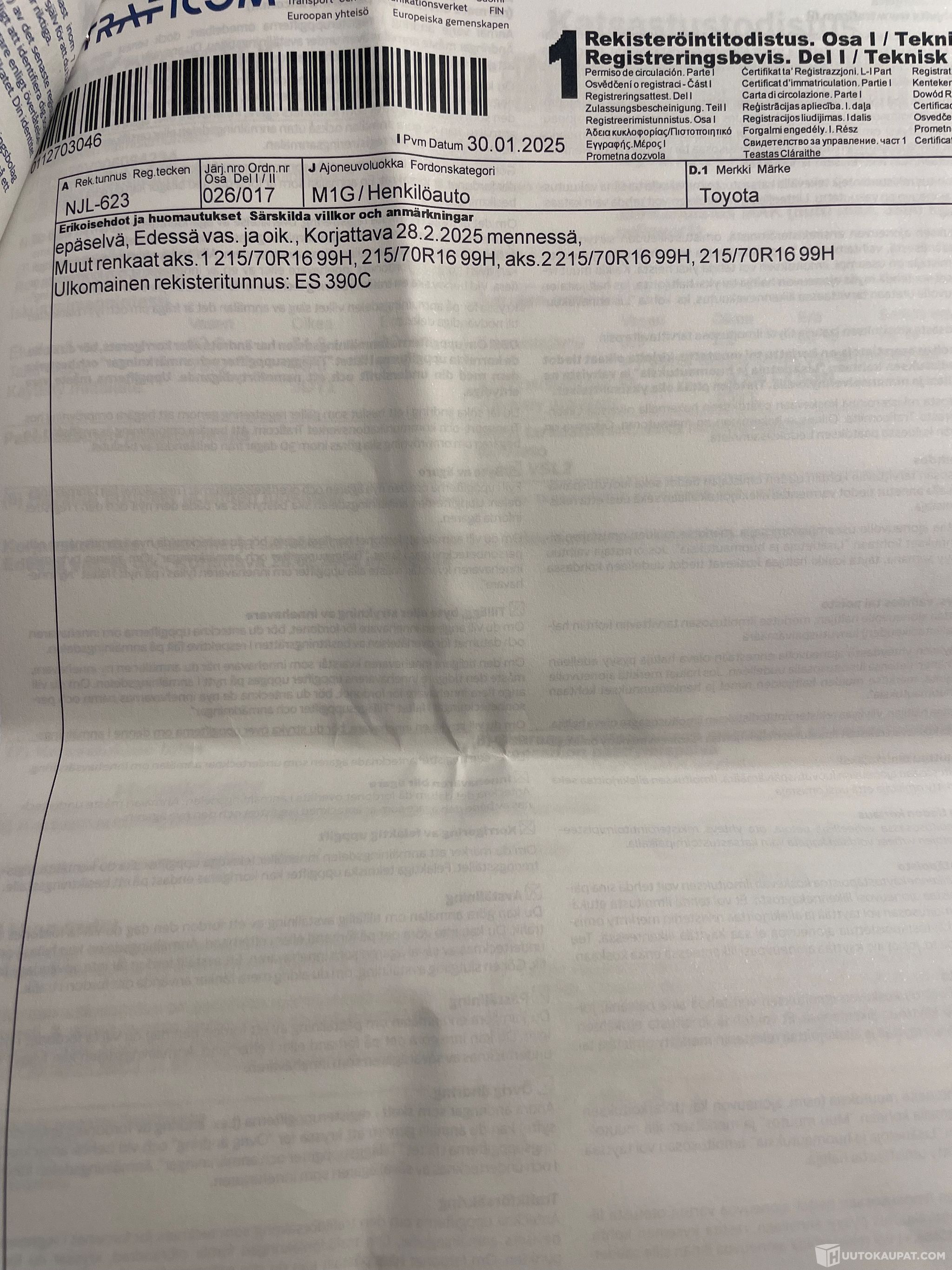 Edellisessä katsastuksessa huomautus epäselvästä valokuviosta, korjauskehotus 28.2.2025 mennessä. Umpiot kellastuneet, mutta lisävalo ollut käytössä.