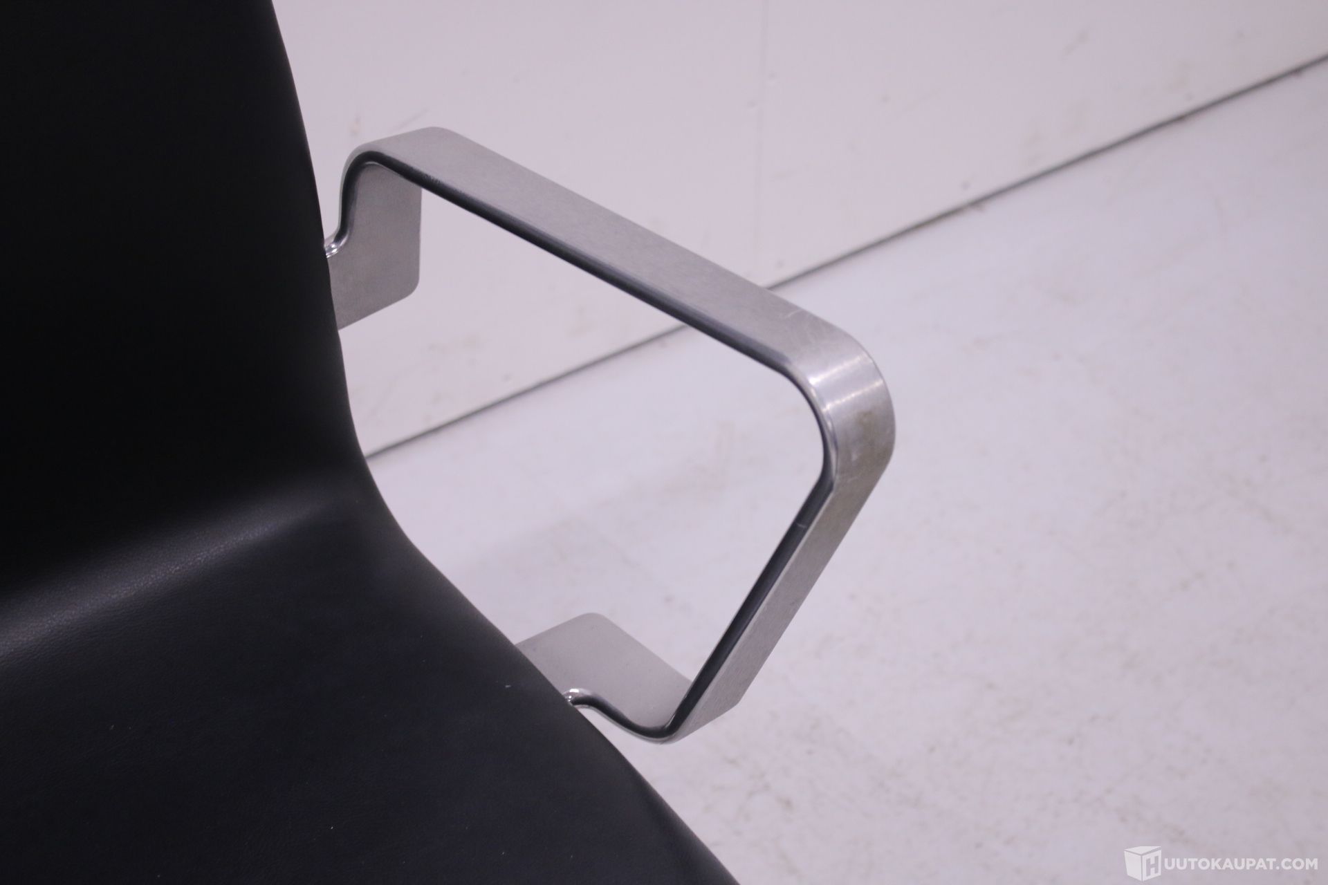 Myynnissä klassinen Fritz Hansen Oxford -työtuoli, joka on Arne Jacobsenin suunnittelema design-ikoni. Tuolissa on korkea selkänoja, musta nahkaverhoilu ja harjatusta alumiinista valmistetut käsinojat sekä viisisakarainen jalusta.