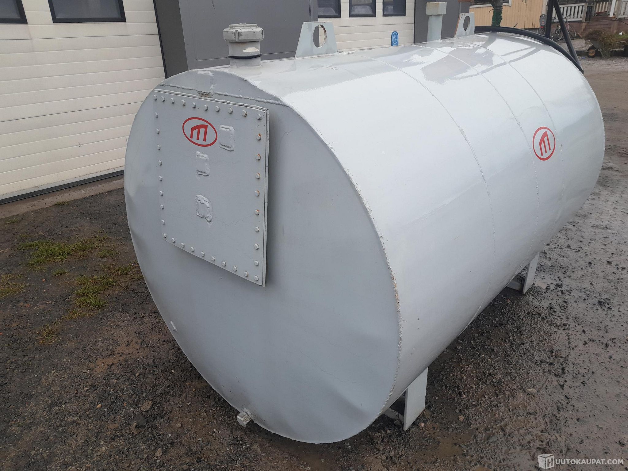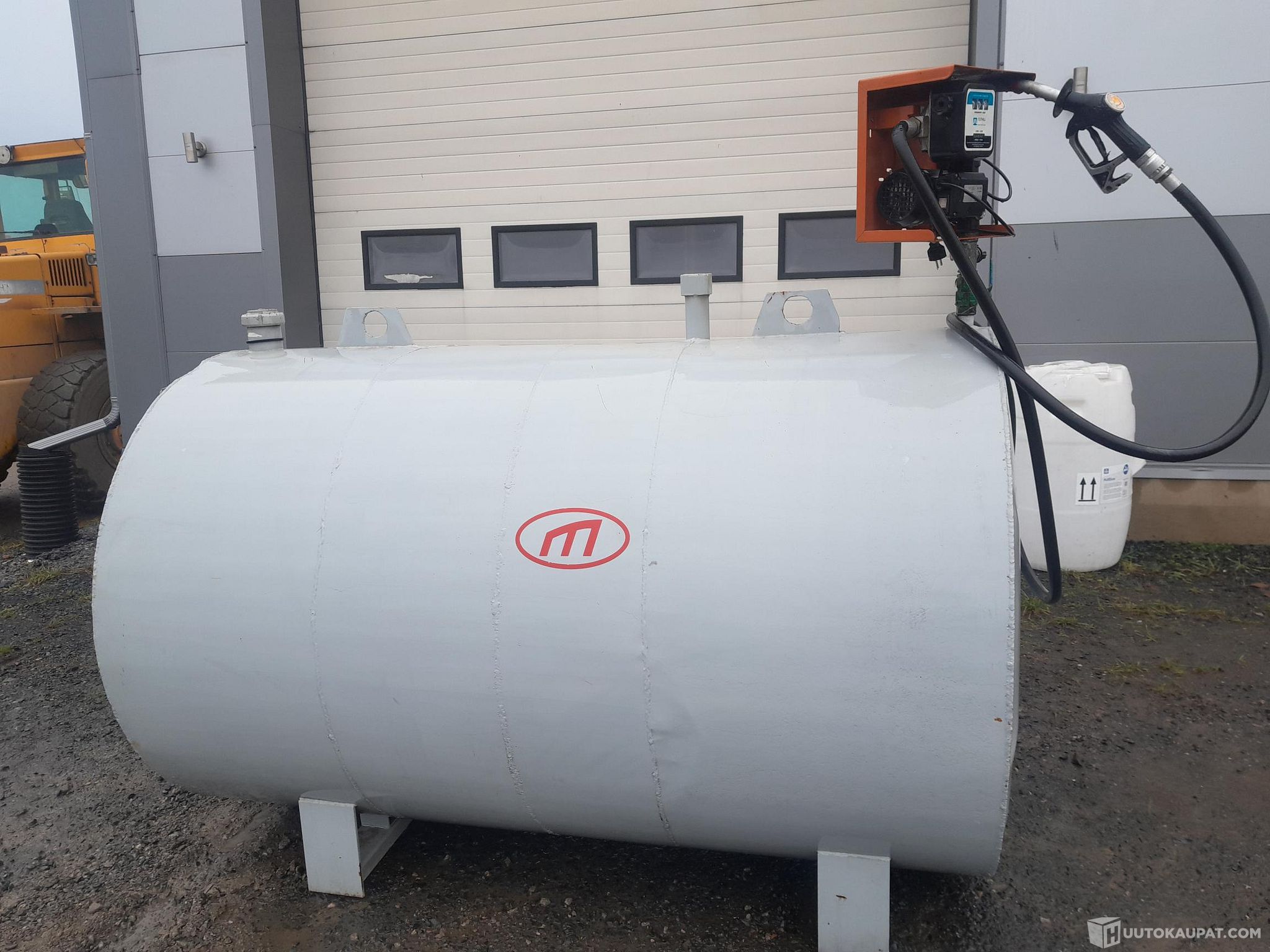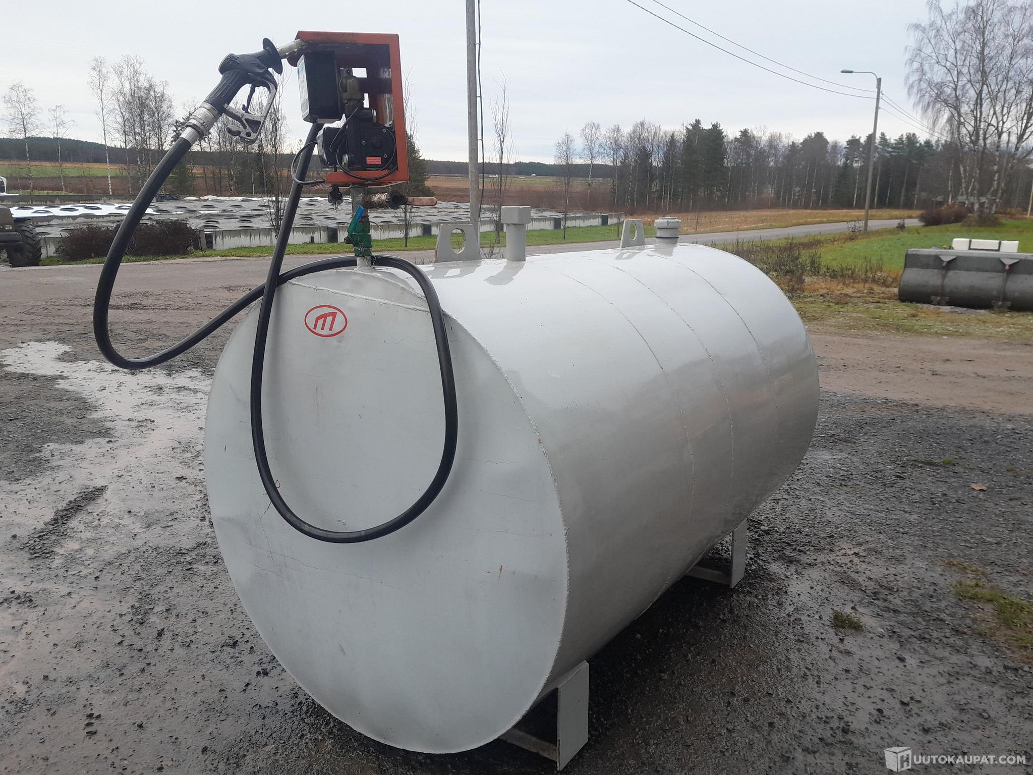 Noin kolme kuution polttoainesäiliö 60 litran pumpulla 230V ja automaattipistooli, täysin toimiva, ei ruostevaurioita, miesluukku.