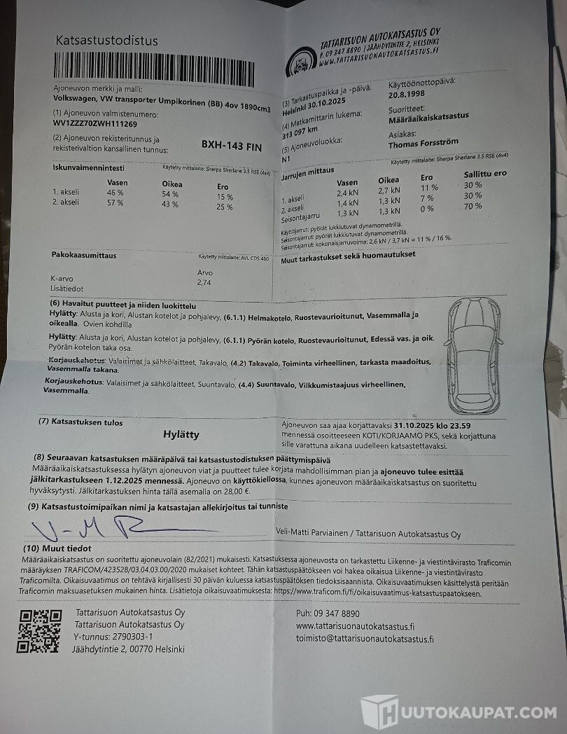 Kuvista löytyy kuva katsastustodistuksesta missä on vikalista.