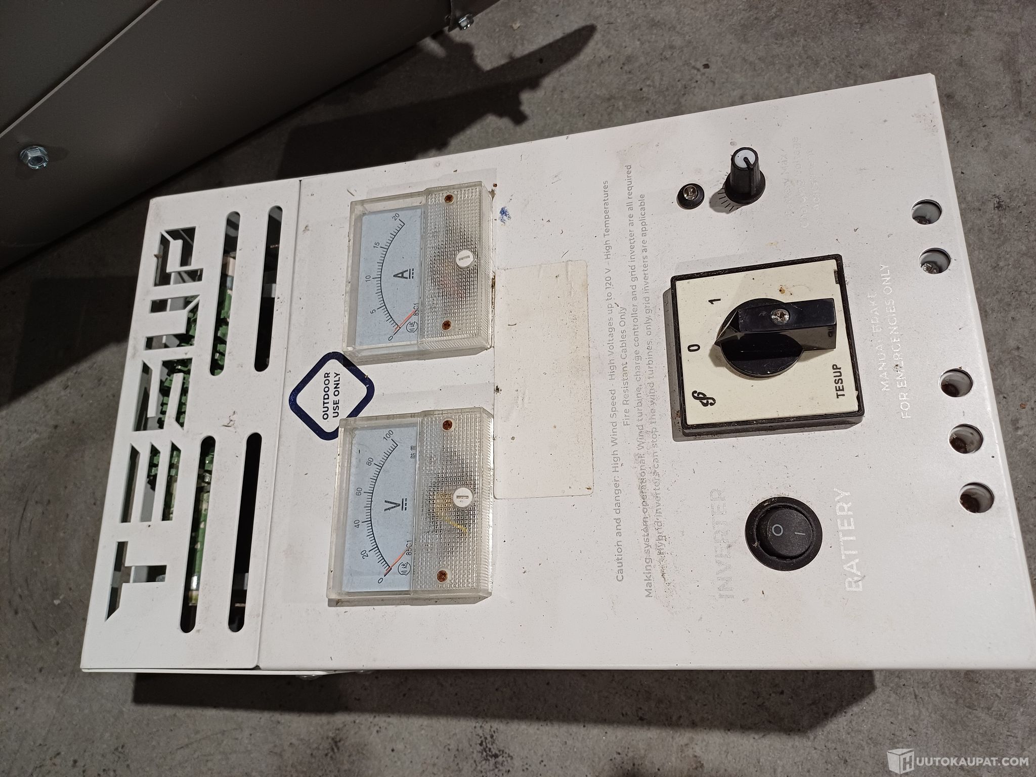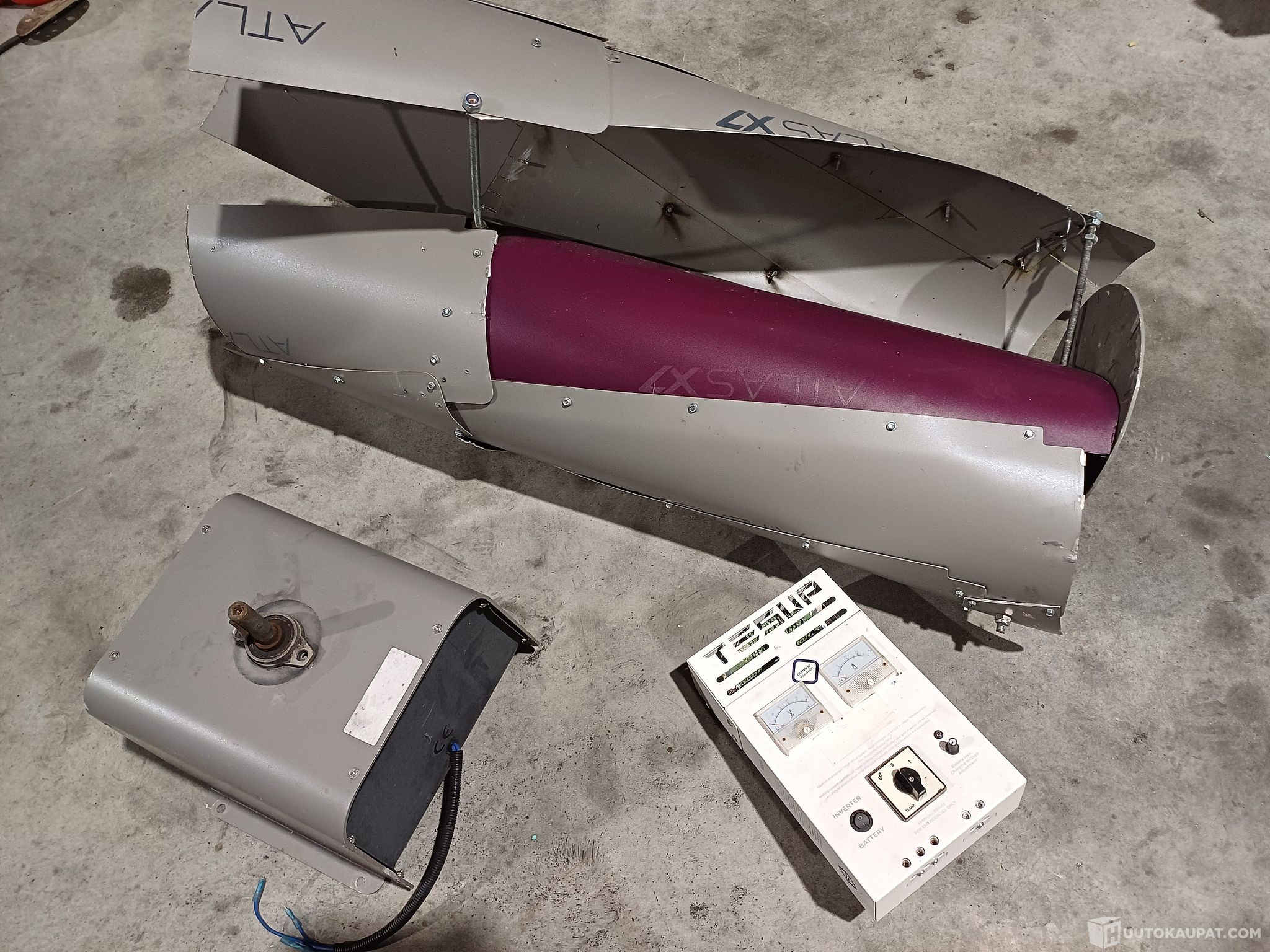 samalla huudolla ulosmitatut tuuliturbiini Tesup Atlas X7, sen generaattori, lataussäädin sekä savunpoistoon tarkoitettu pienikokoinen Nederman -merkkinen suodatinlaite.