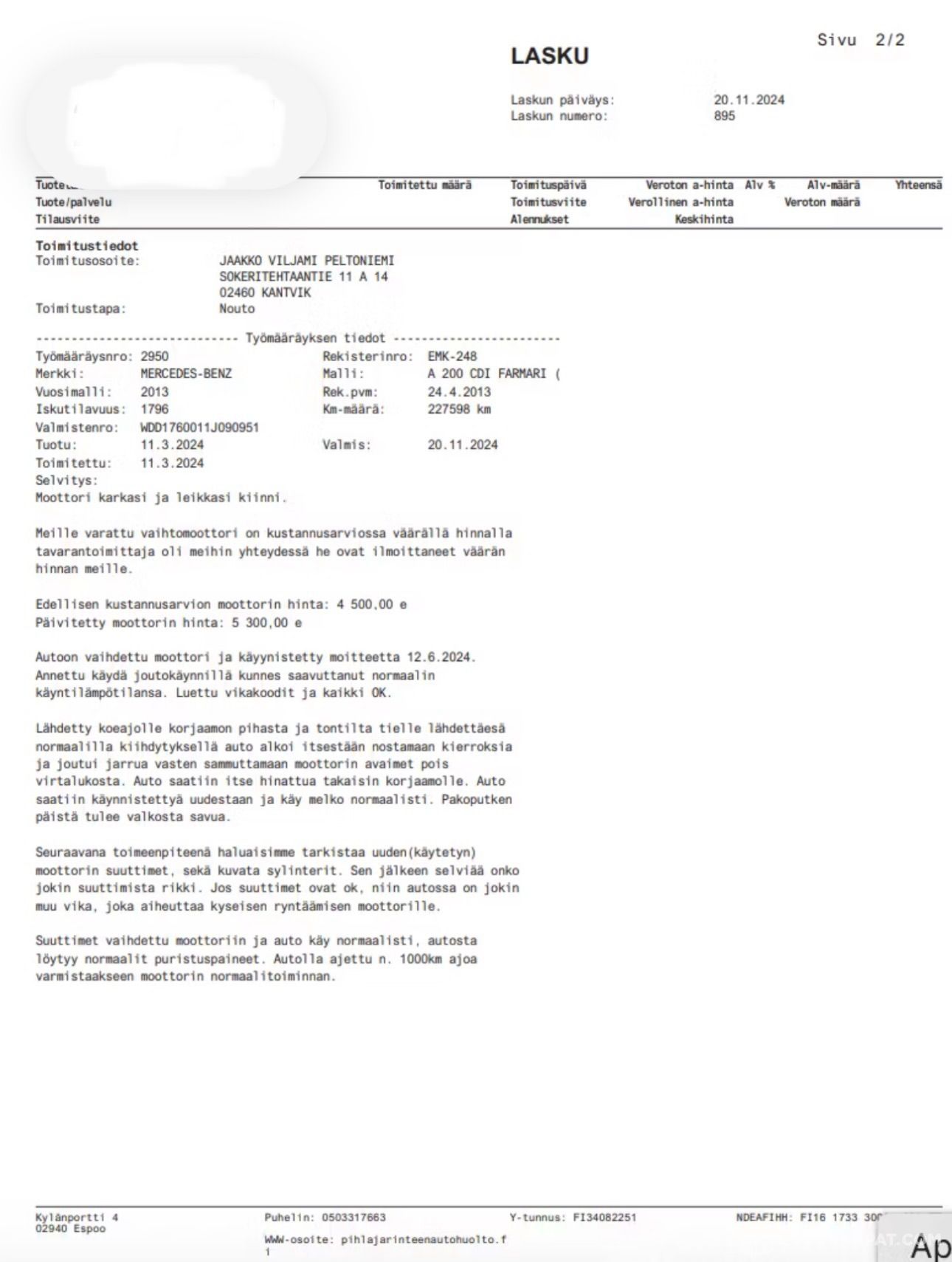 Moottori vaihdettu 12/2024 (käytetty) 6997e kuitti, lisätty kuviin!