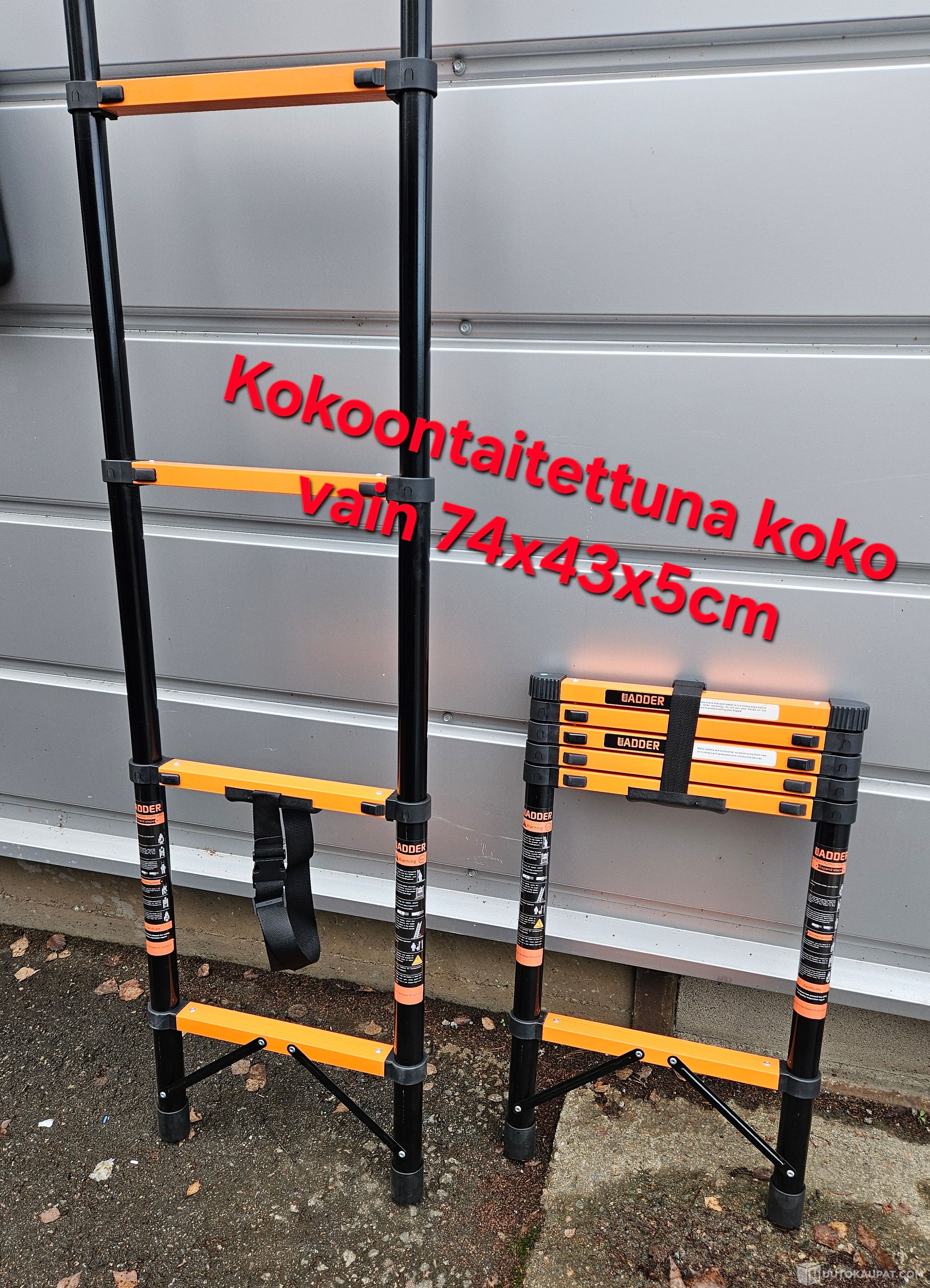 Koko taitettuna 74x43x5cm, eli todella kompakti laitos jokaisen auton takakonttiin tai pajalle.