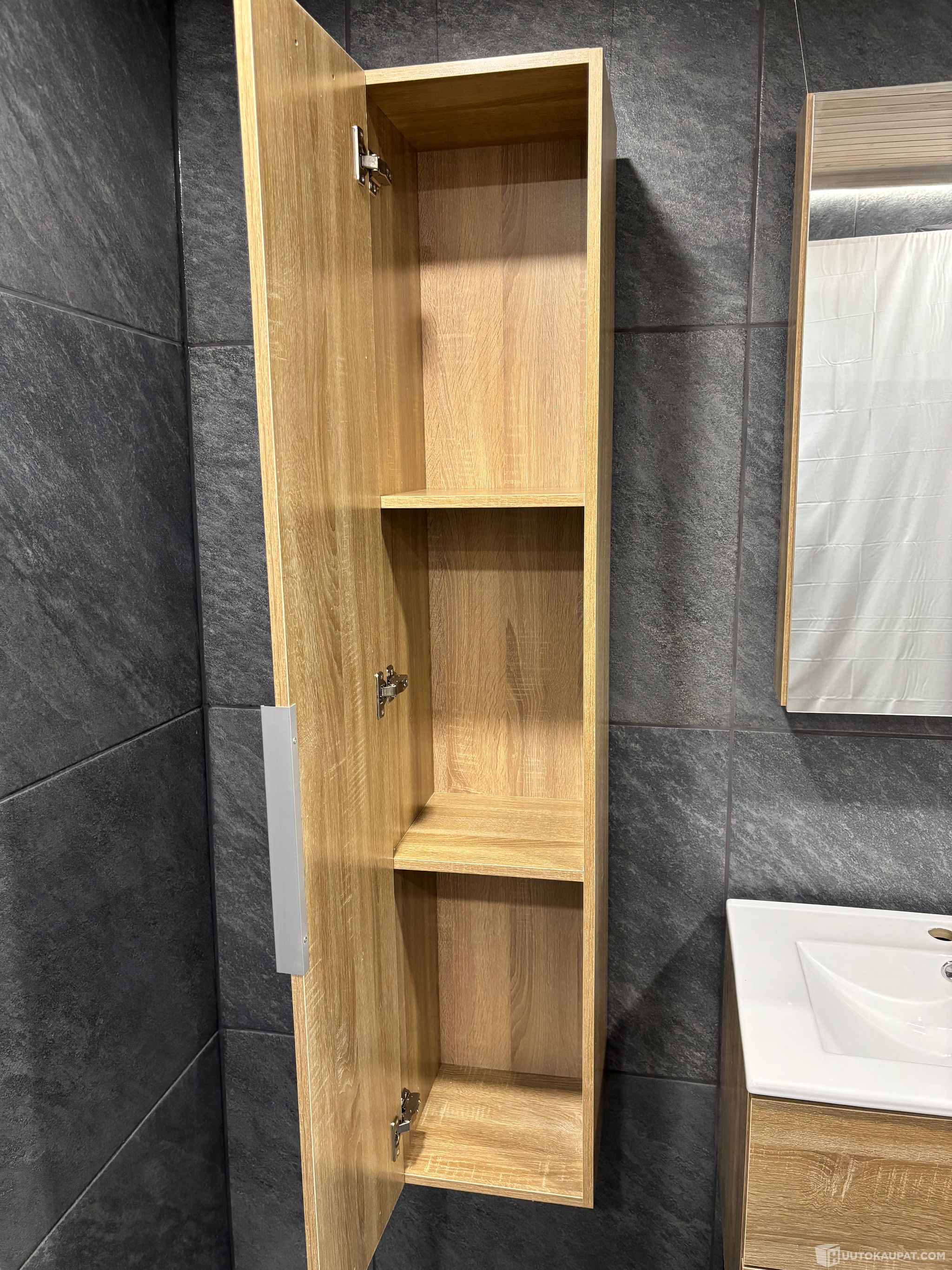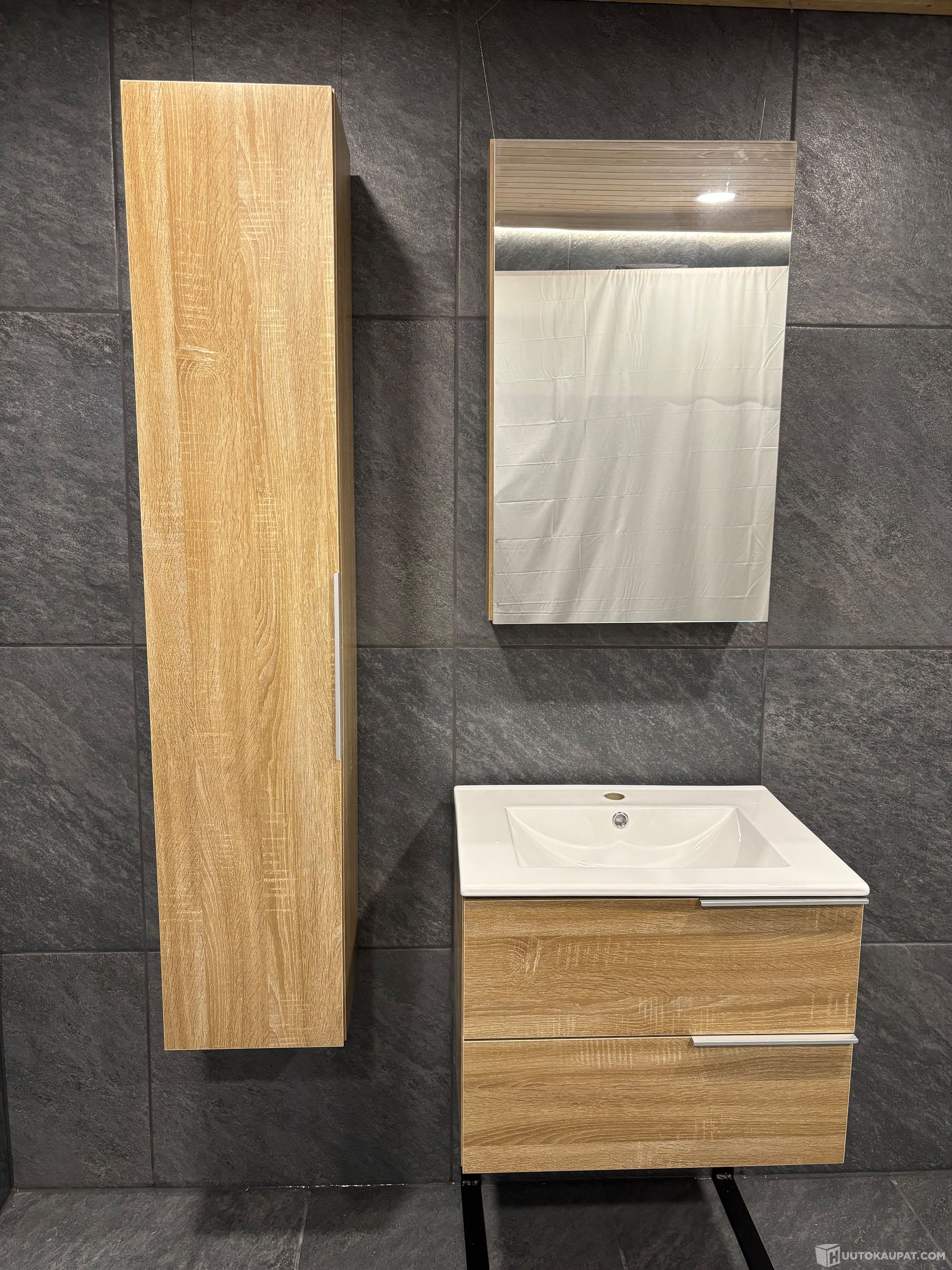 Allaskaluste kokonaisuus keraamisella altaalla, sivukaapilla ja peilikaapilla, vaalea puunsyy, Sastamala