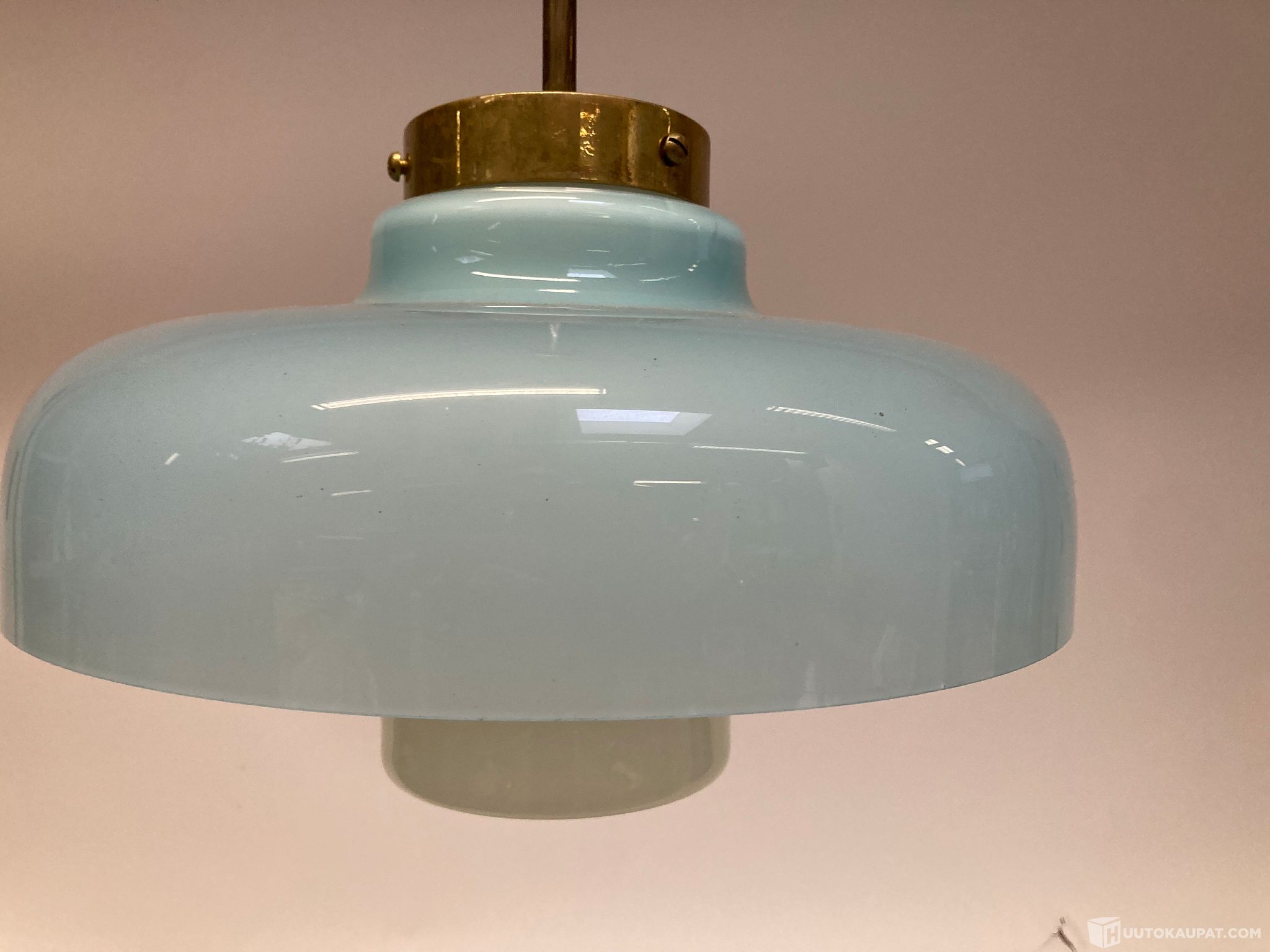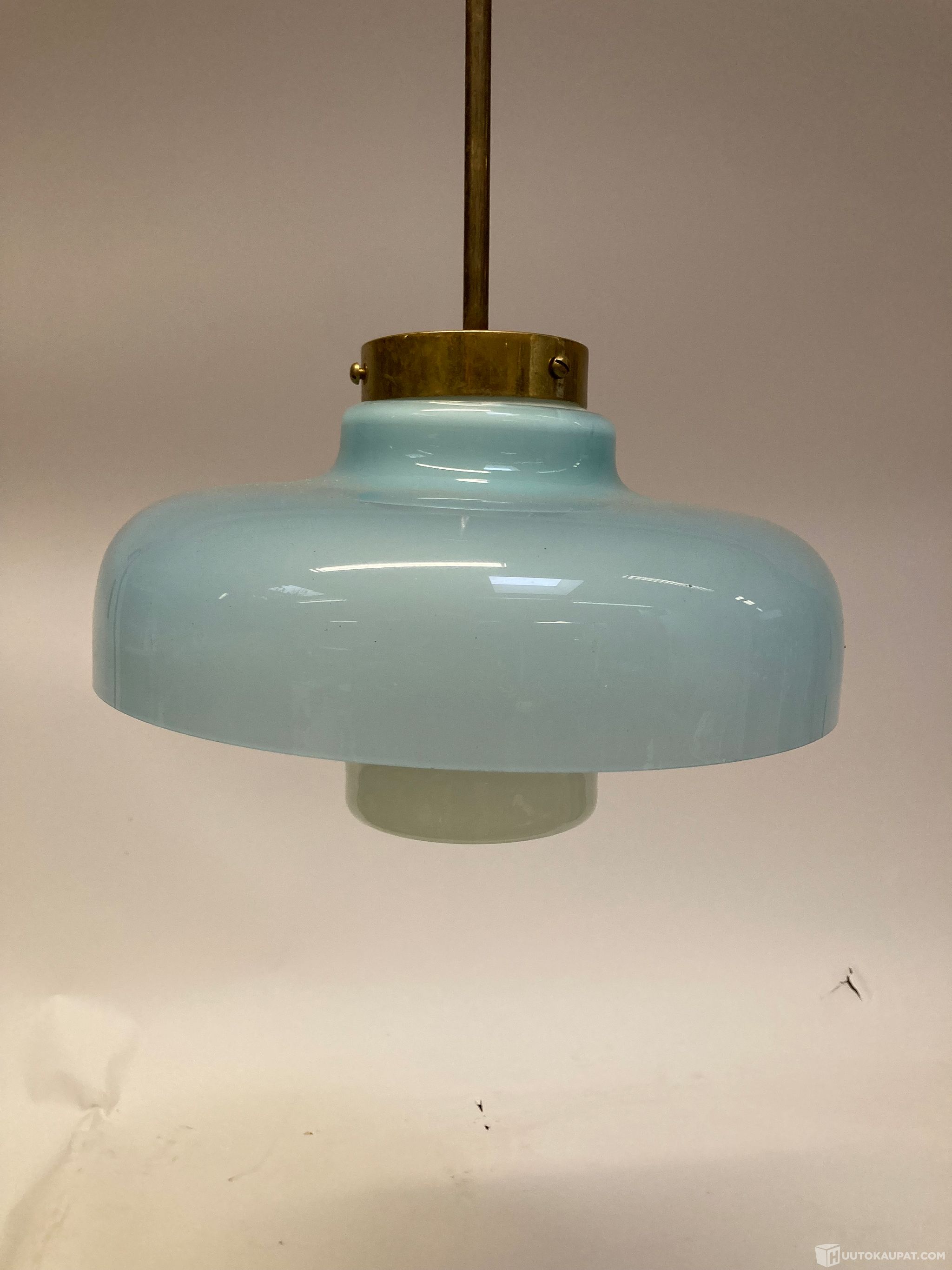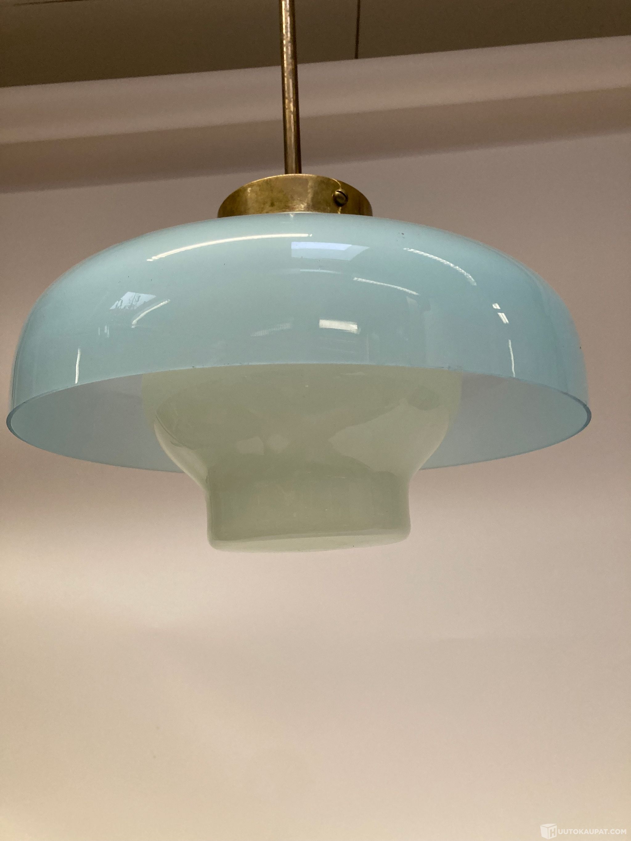 Paavo Tynellin suunnittelema tyylipuhdas 1950-luvun valaisin. Valkoinen ja vaaleansininen lasikuvut sekä metalliosat messinkiä. Erityisen hieno ja ehjä. kevytrakenteinen, läpikuultavan hohdokas design valaisin suomalaiselta mestarilta.