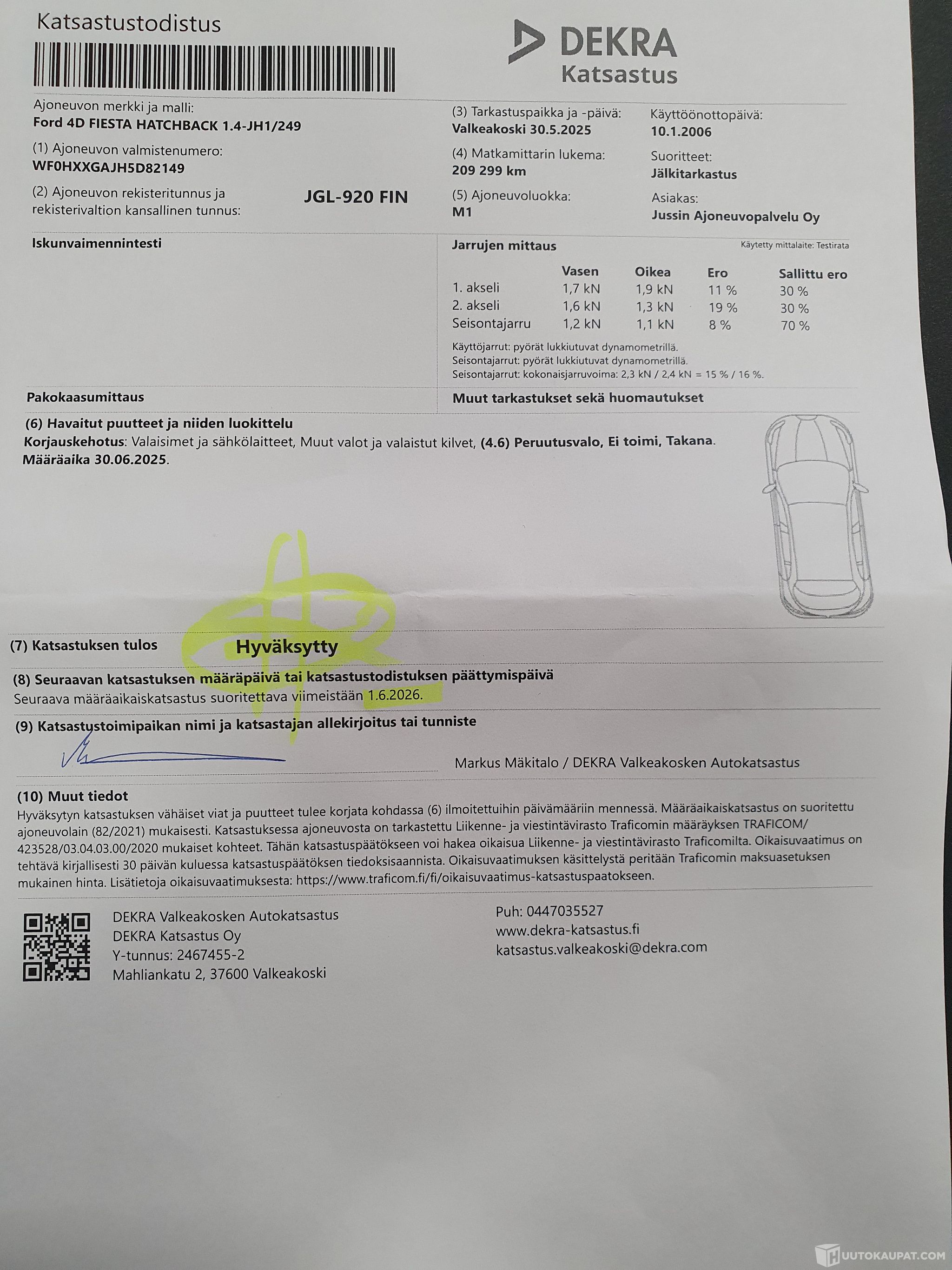 Auto ei ole ollut toimestamme teknisessä kuntotarkastuksessa eikä kaikkien varusteiden toimivuutta ole testattu. Siinä saattaa olla piileviä vikoja, joita koeajolla emme havainneet. Autoon on mahdollista tulla tutustumaan tarkemmin ennen sitovan huudon tekemistä. Sovithan tulostasi etukäteen, kiitos.