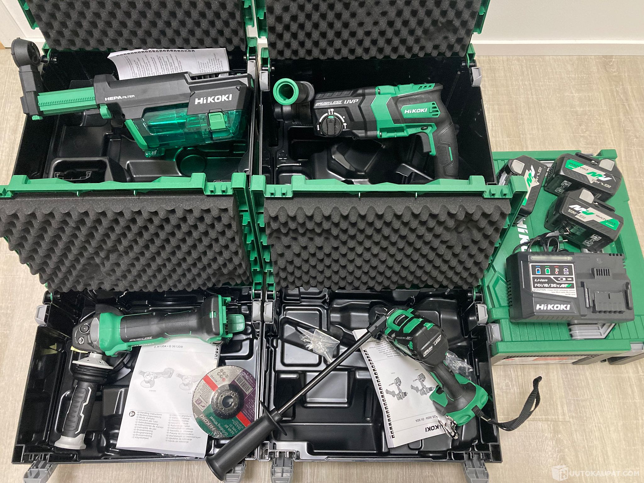 Hikoki akkukonesarja 36V Multivolt. Poravasara DH63DPE + hepa pölynpoistojärjestelmällä, porakone DS36DA ja kulmahiomakone G3613DA. Mukana 3 x 36V Multivolt akkua ja laturi.