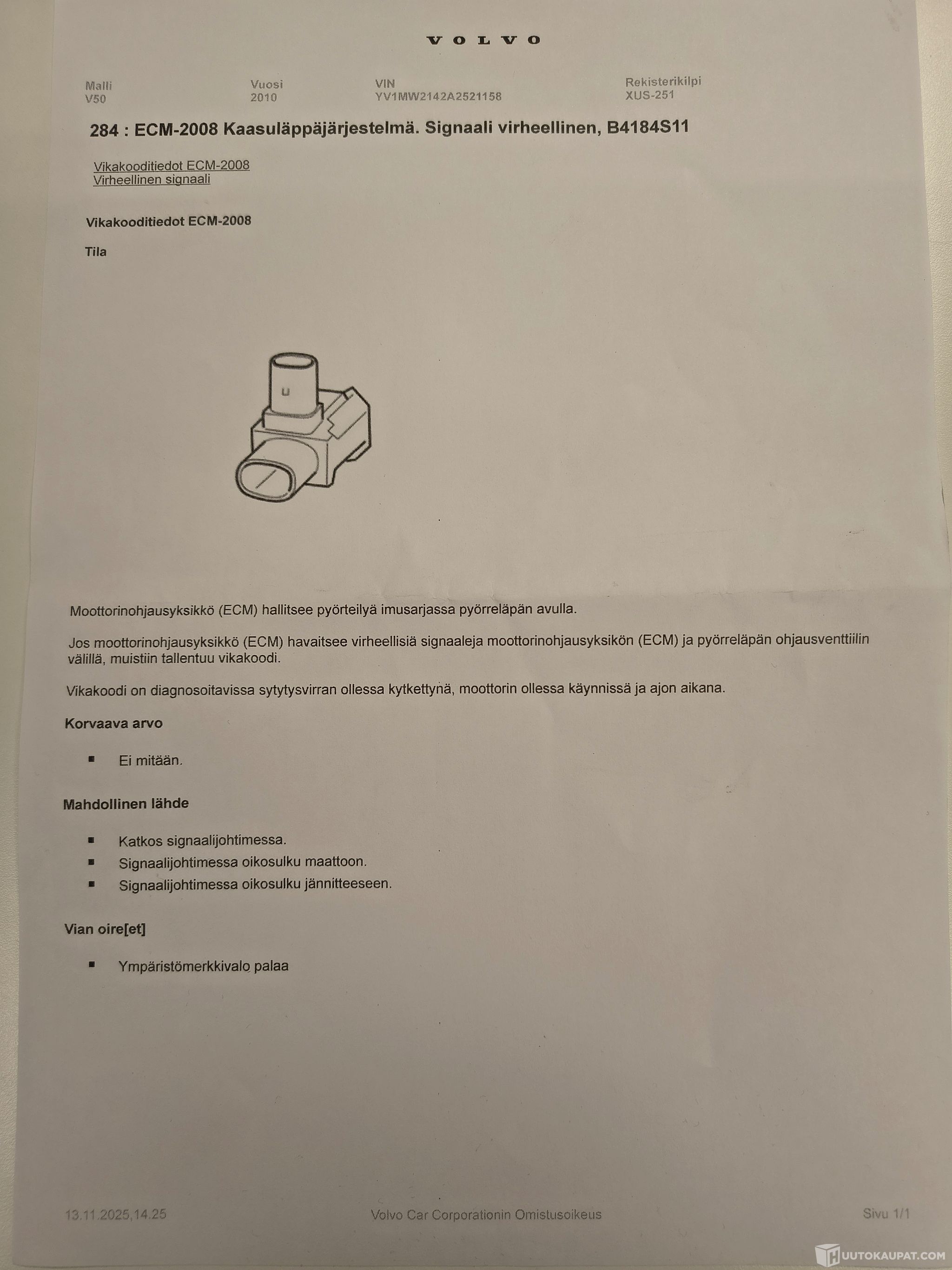 - Moottorinhäiriö valo palaa, vikakoodi kaasuläpältä. Vikakooditiedot kuvissa.