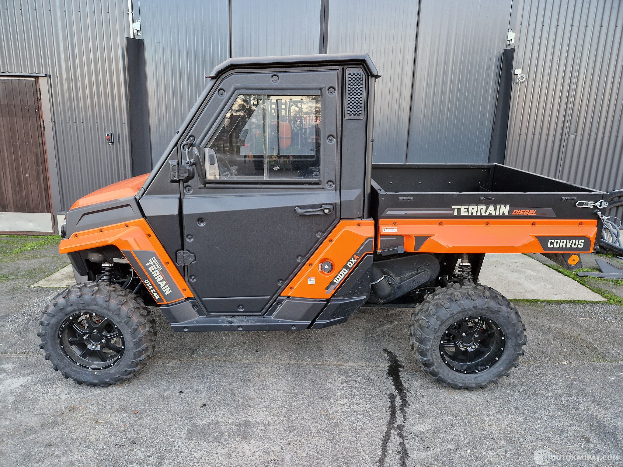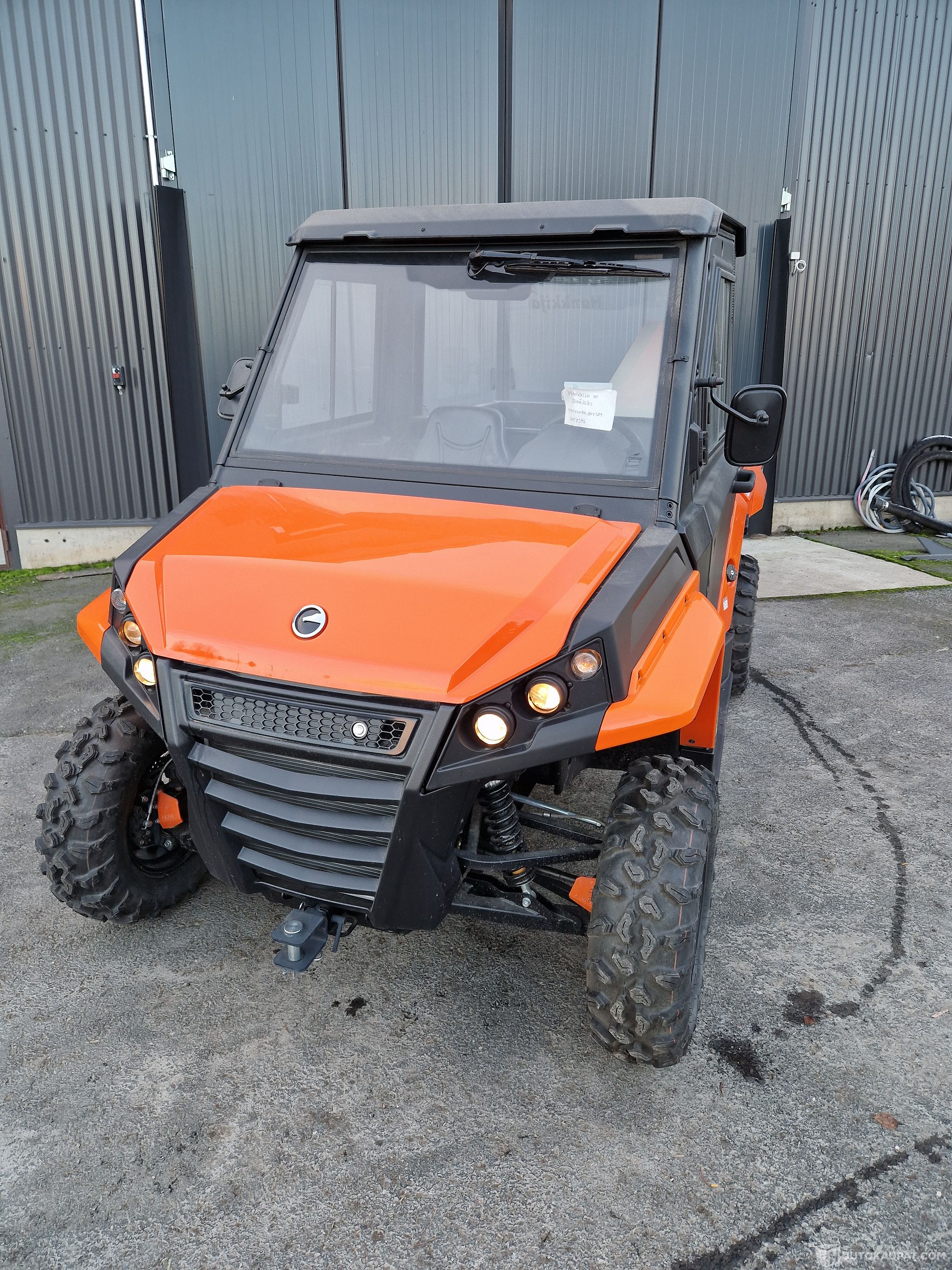 Vakiovarusteet Tuulilasi pyyhkijällä, takalasi, ovisarja, lämmityslaite, pohjan suojalevy, etuvetopiste, sisävalo, taustapeili, ohjaustehostin, kaksi säädettävää istuinta turvavöin, lukittava poltttoainetankin korkki.