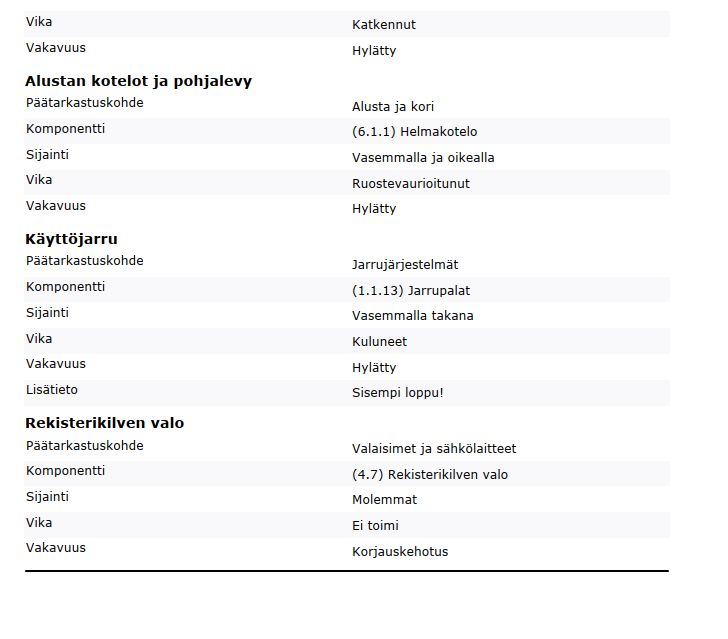 Kuvien vikalistojen lisäksi käsijarrussa vikaa ja kesä- ja talvirenkaissa kummassakin sarjassa ainakin yksi vuotava rengas. Kuljettajan puoleinen takapenkin ovi ei aukea. Muista vioista ei tietoa. Auto koeajettu 14.11 ja käynnistyi normaalisti.