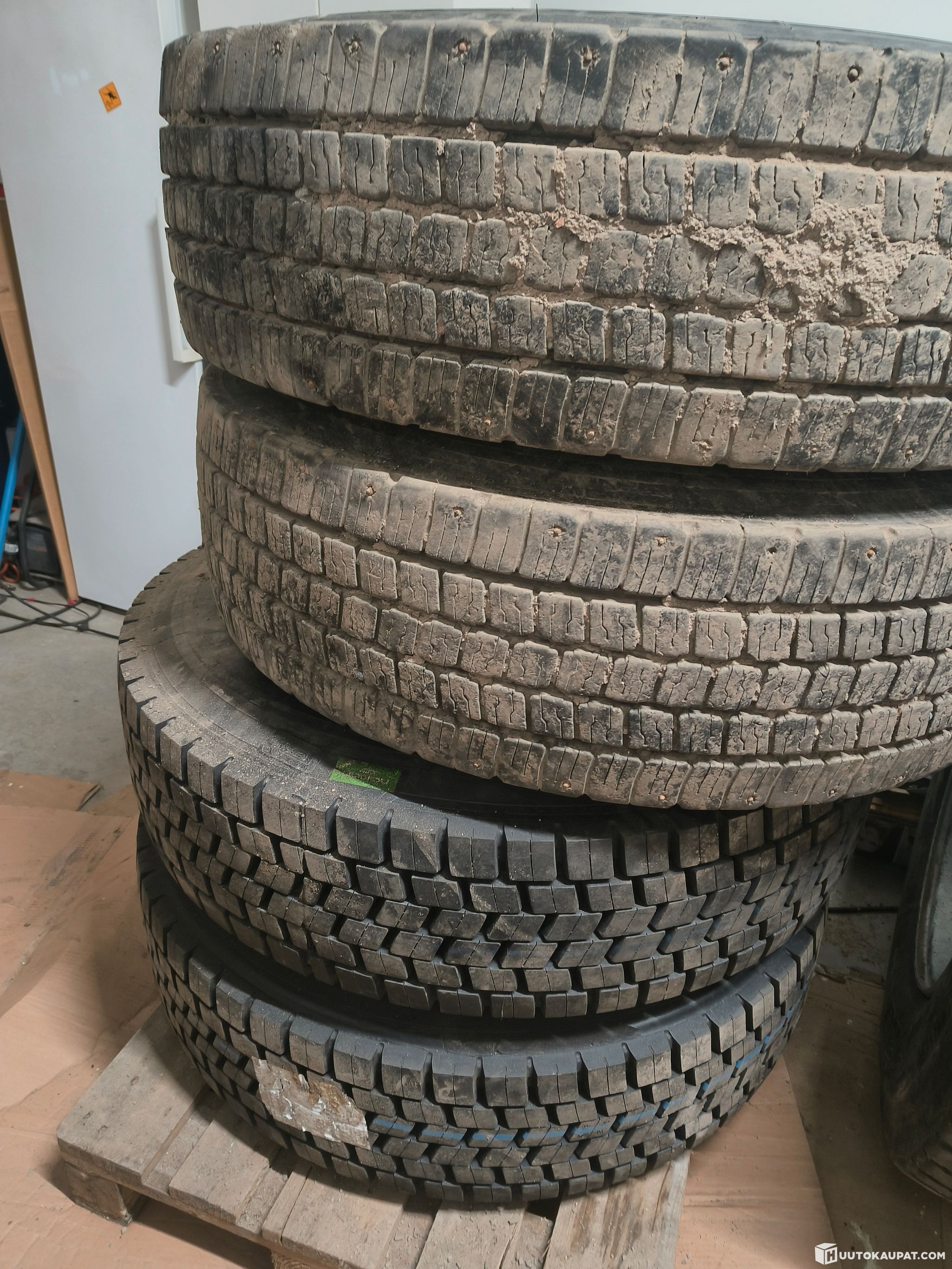 Käytetyt kuorma-auton renkaat 4 kpl 315/80 R 22.5 vanteilla. Vähän käytetyt. Kahdessa päällimmäisessä renkaassa on nastat, olleet eturenkaina.