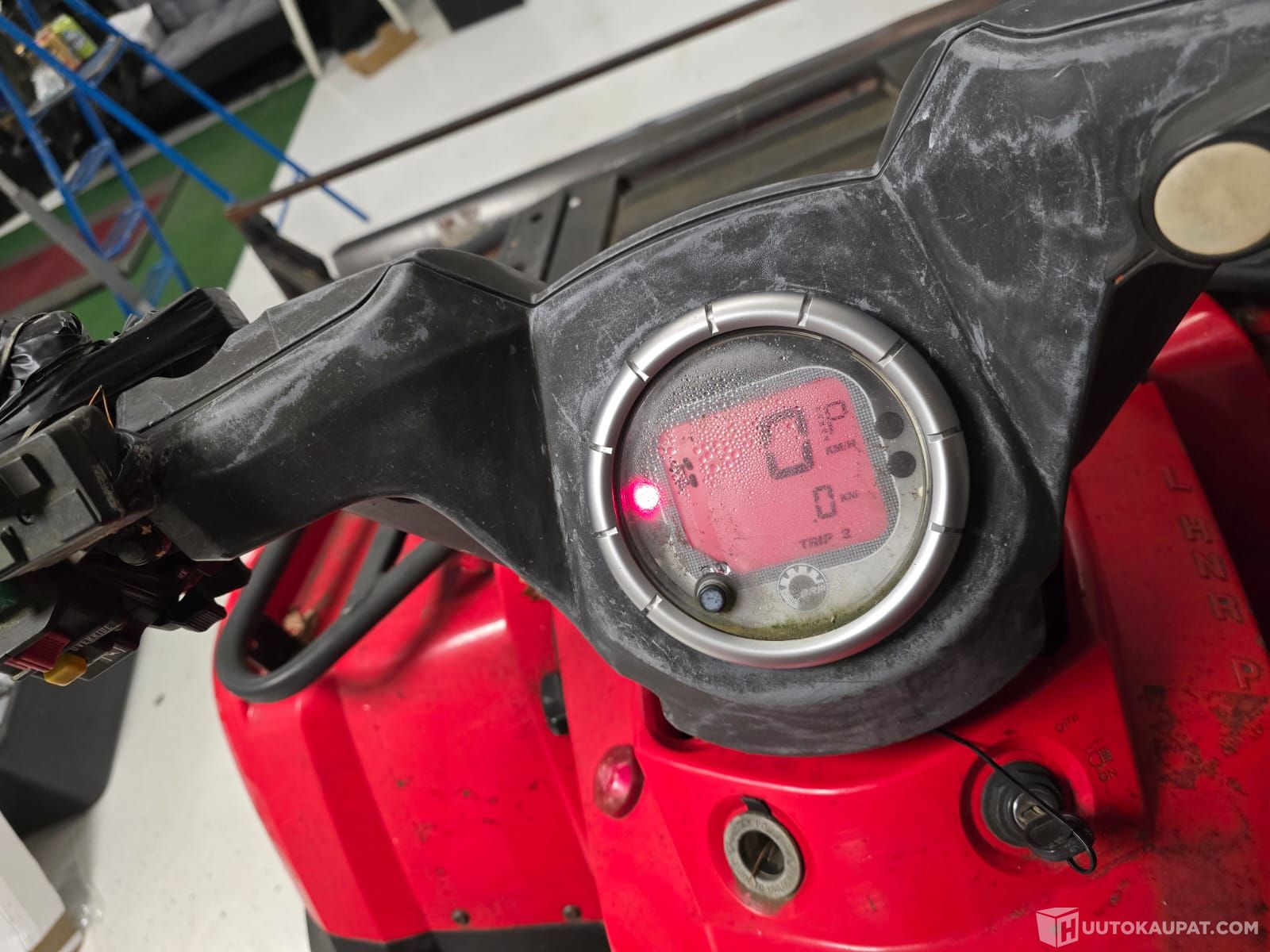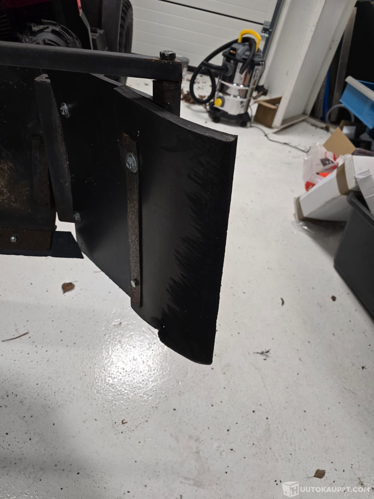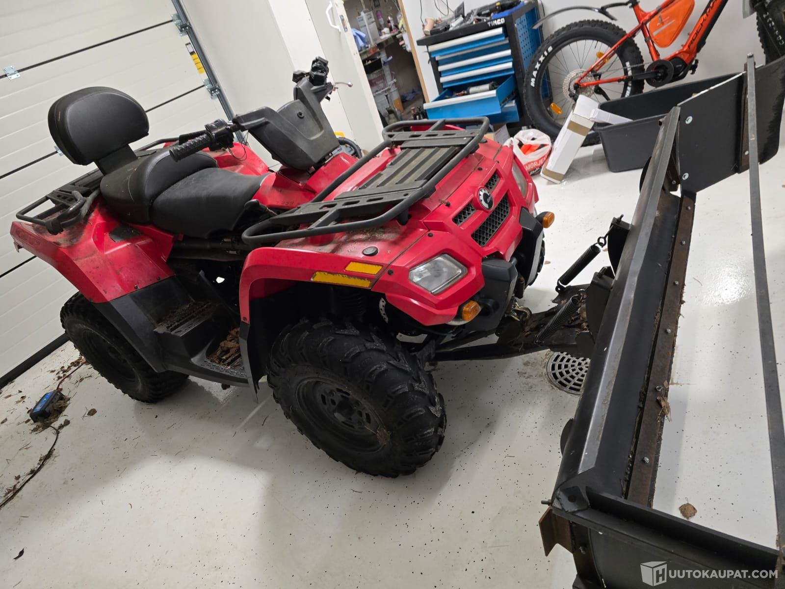 Toisen puolen sivukate puuttuu, kaikenlaisia käytönjälkiä varmasti on. Kostealla kelillä mittaristo sekoilee, ei vaikuta ajamiseen. Aura on lukittu tuohon yhteen asentoon. Aurassa välystä mutta tosi hyvä aurata kun on nuo sivulipat ja toisella puolen paksu kumi niin voi mennä seinustoja pitkin. Viime talvena kävi huollossa jossa kaasarin puhdistus ja uusi kurkku kun oli joku vuoto. Takarenkaat huonot.