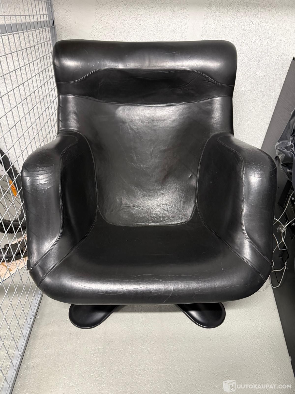 Tuoli on käyttökunnossa: tuoli pyörii normaalisti ja mekanismi toimii. Nahkaverhoilu on alkuperäinen ja siinä on normaalia patinaa sekä pieni repeämä käsinojan etuosassa (näkyy kuvissa).