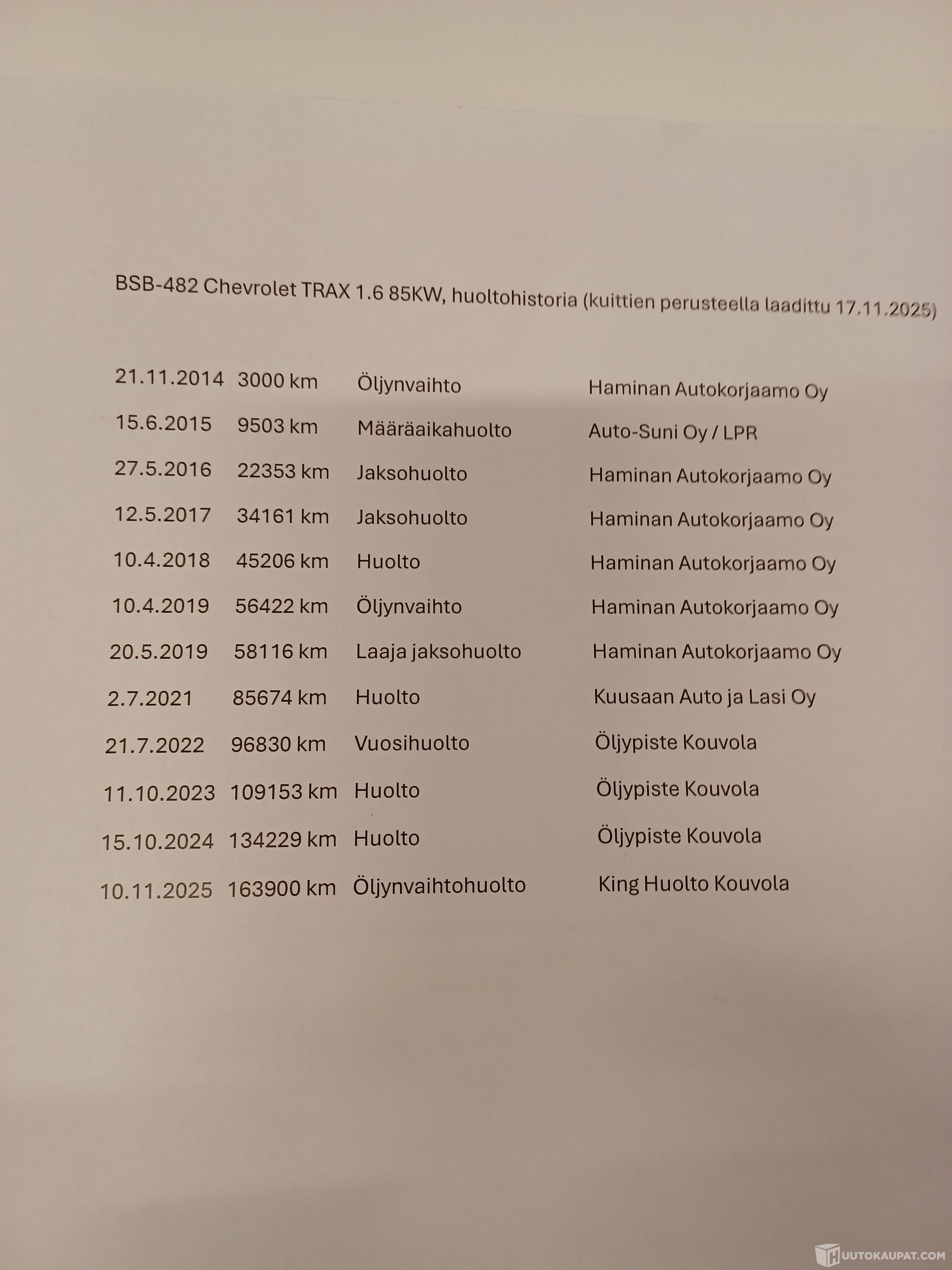 - Huoltokirja kadonnut, mukana runsaasti huoltokuitteja (yhteenvedosta kuva)