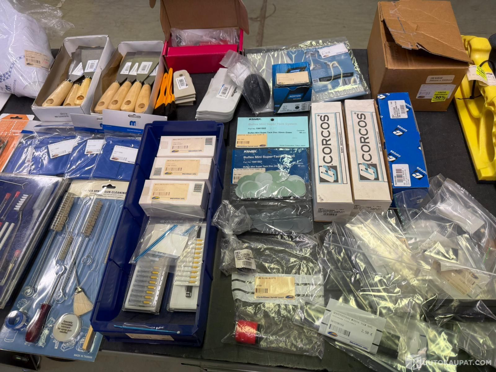 Maaliruiskun pesu ja puhdistus settejä, maalinkorjaustikkuja, Slim s suutin sarjat 2kpl, adapterit, korjaussarja genesi, sekoitustikkuja, kittilastoja ynnämuuta tarviketta.