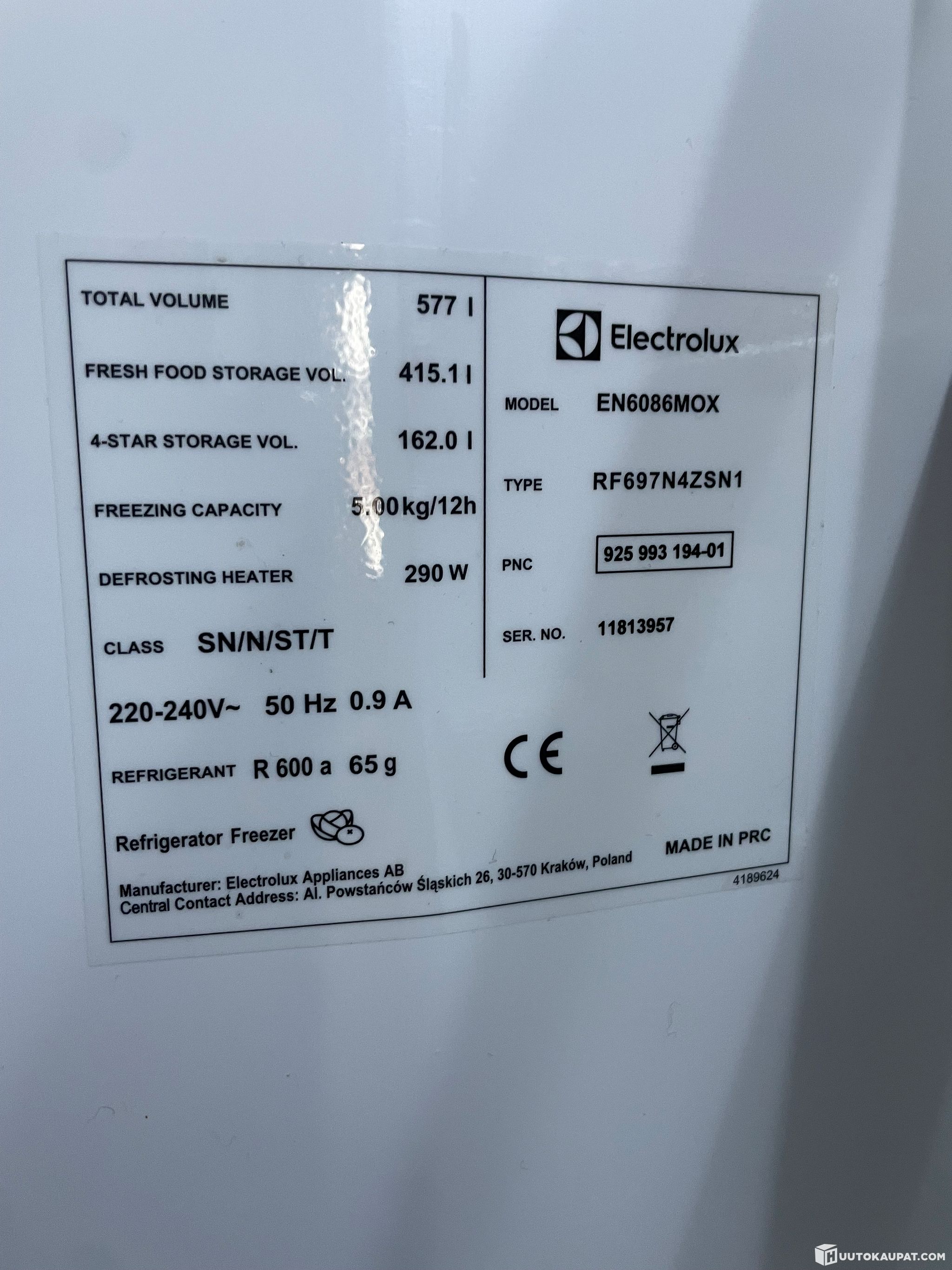 Tilavuus: Jääkaappi 415 l / Pakastin 168 l