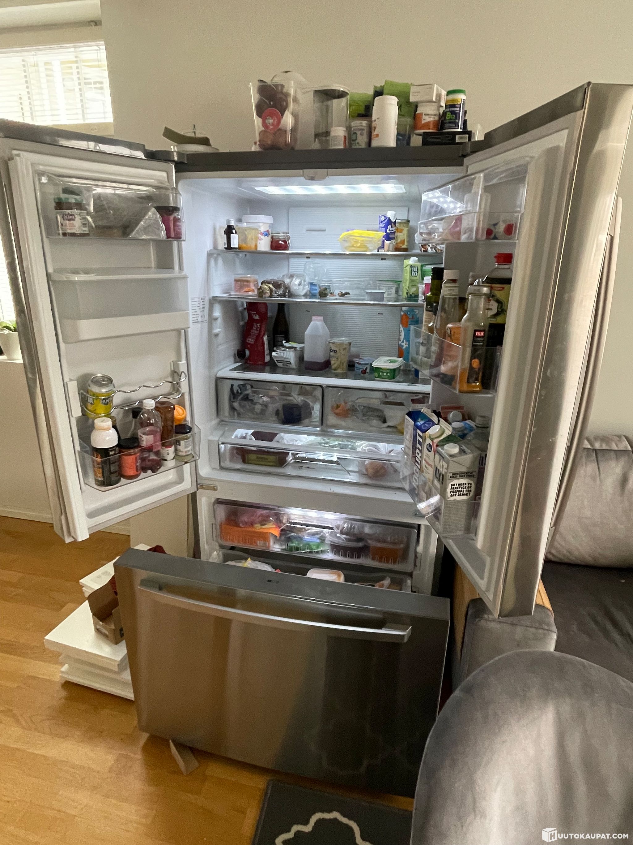 Erittäin tilava ja energiatehokas side by side ranskalaisilla ovilla ja suurella 536 litran tilavuudella. Käyttömukavuutta lisää yläosaan sijoitettu suuri 417 litran jääkaappi, näet koko kaapin sisällön kerralla ilmaan turhaa kumartelua. Ulosvedettävästä pakastinlaatikosta näet pakastimen sisällön, sinun ei tarvitse availla erillisiä laatikoita etsiessä tarvitsemaasi pakastetta.