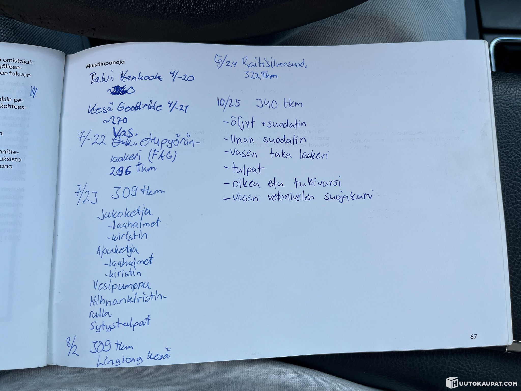 Autoon löytyy täydellinen huoltokirja ja viimeisimmässä huollossa on vaihdettu seuraavat osat: