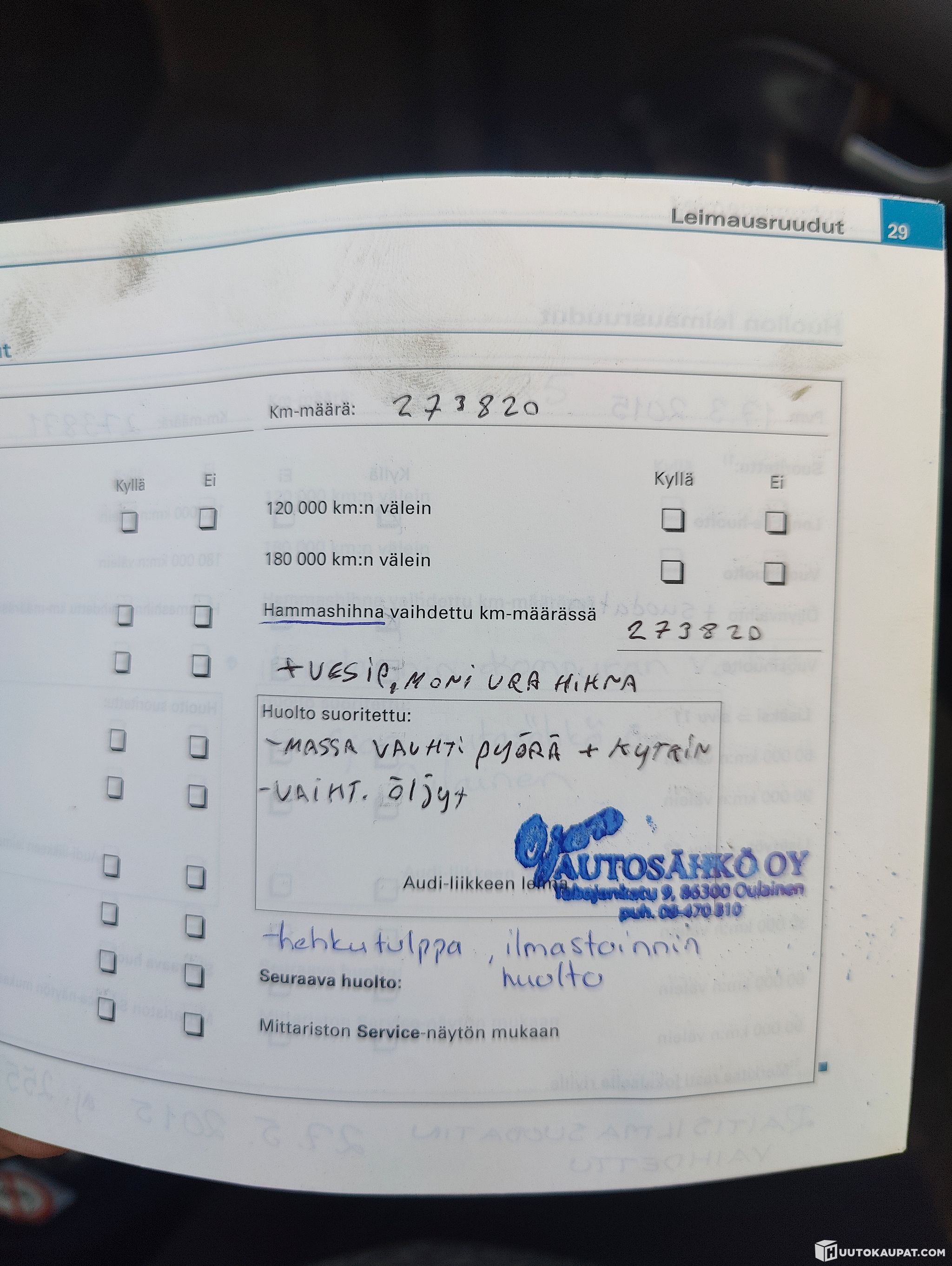 Kyllä, Viimeisin huolto Öljyt + suodatin, takajarrut + käsijarruvaijerit.
